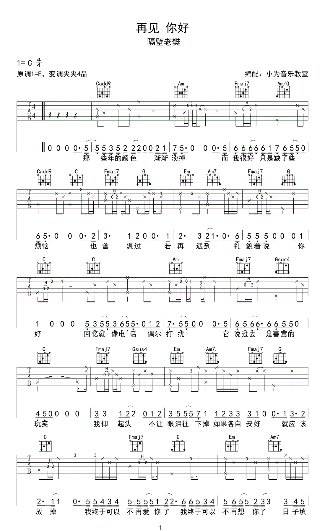 再见你好吉他谱 - 隔壁老樊 - C调吉他弹唱谱 - 原版