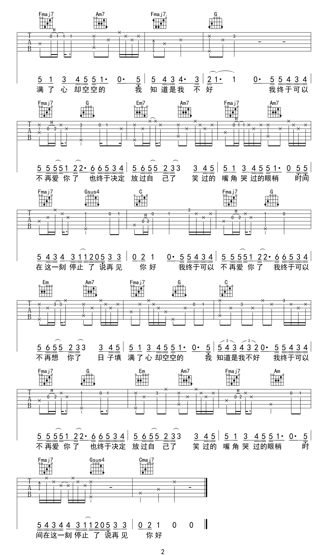 曲谱介绍: 隔壁老樊《再见你好》吉他弹唱谱,采用C调指法编配原版,共有2张高清图谱,免翻页排版设计。