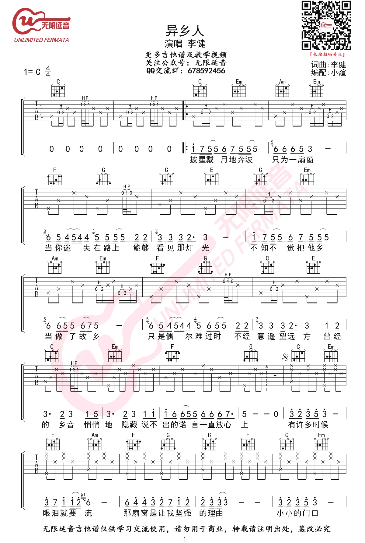 琴谱网为您精心推荐 异乡人 高清图谱