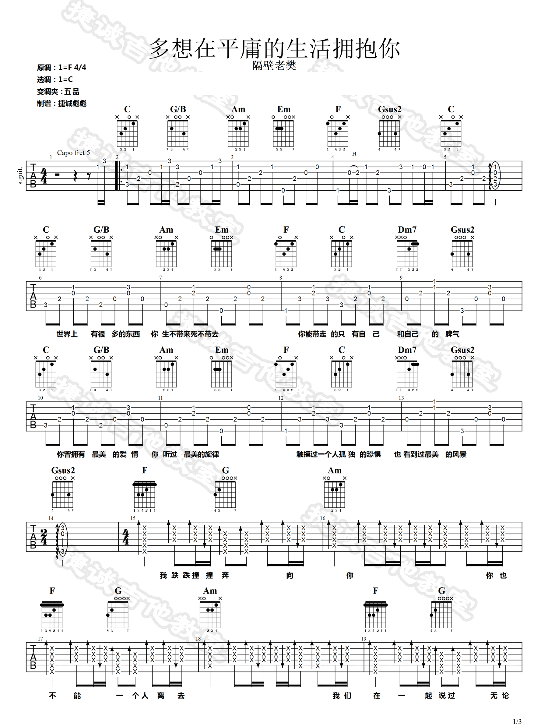 曲谱介绍: 隔壁老樊《多想在平庸的生活拥抱你》吉他弹唱谱,采用C调指法编配原版,共有3张高清图谱。