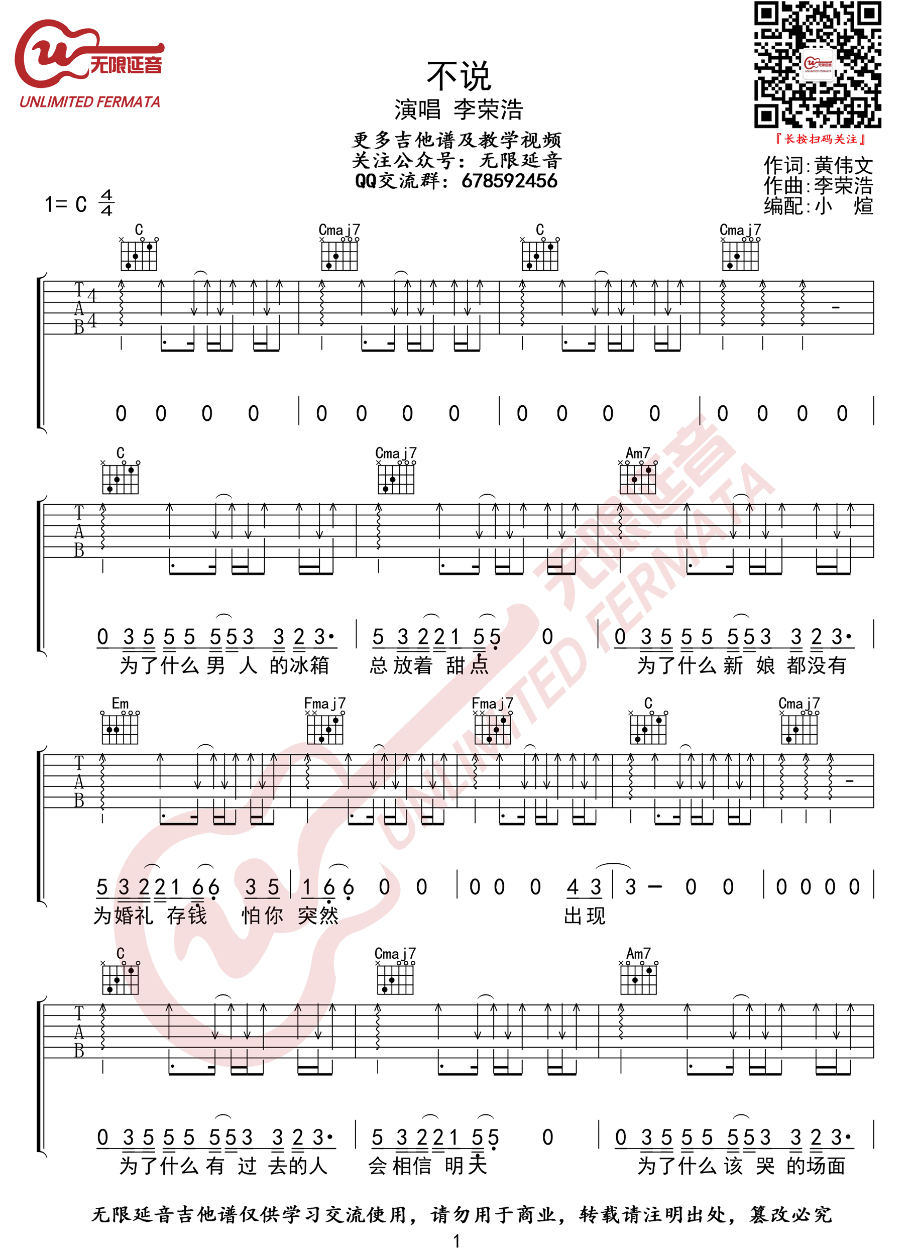 曲谱介绍: 李荣浩《不说》吉他弹唱谱,采用C调指法编配原版,共有4张高清图谱。