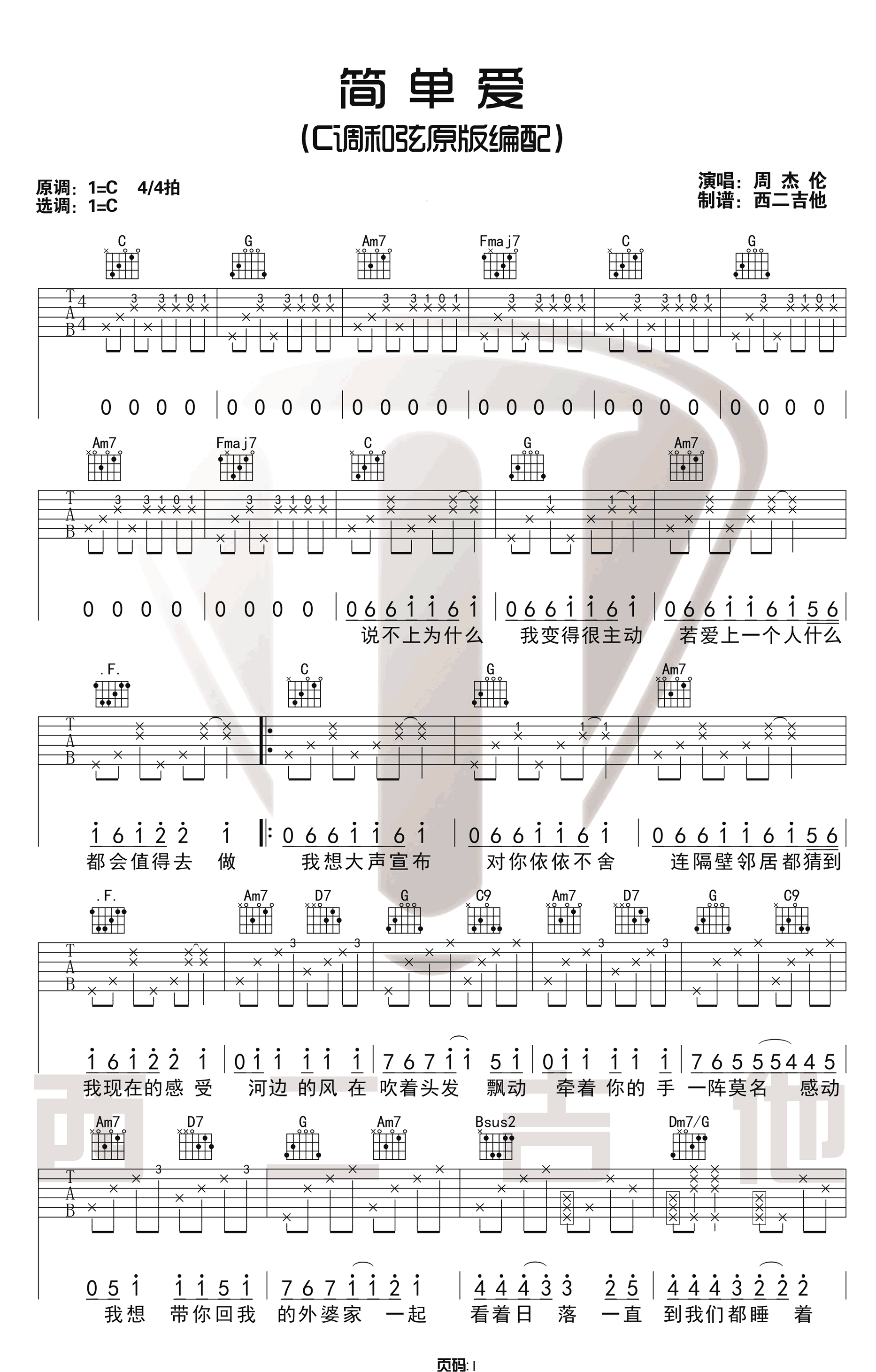 简单爱吉他谱 - 周杰伦 - C调吉他弹唱谱 - 原版