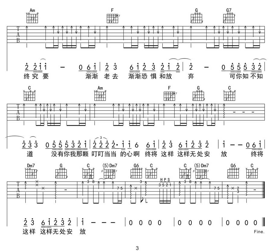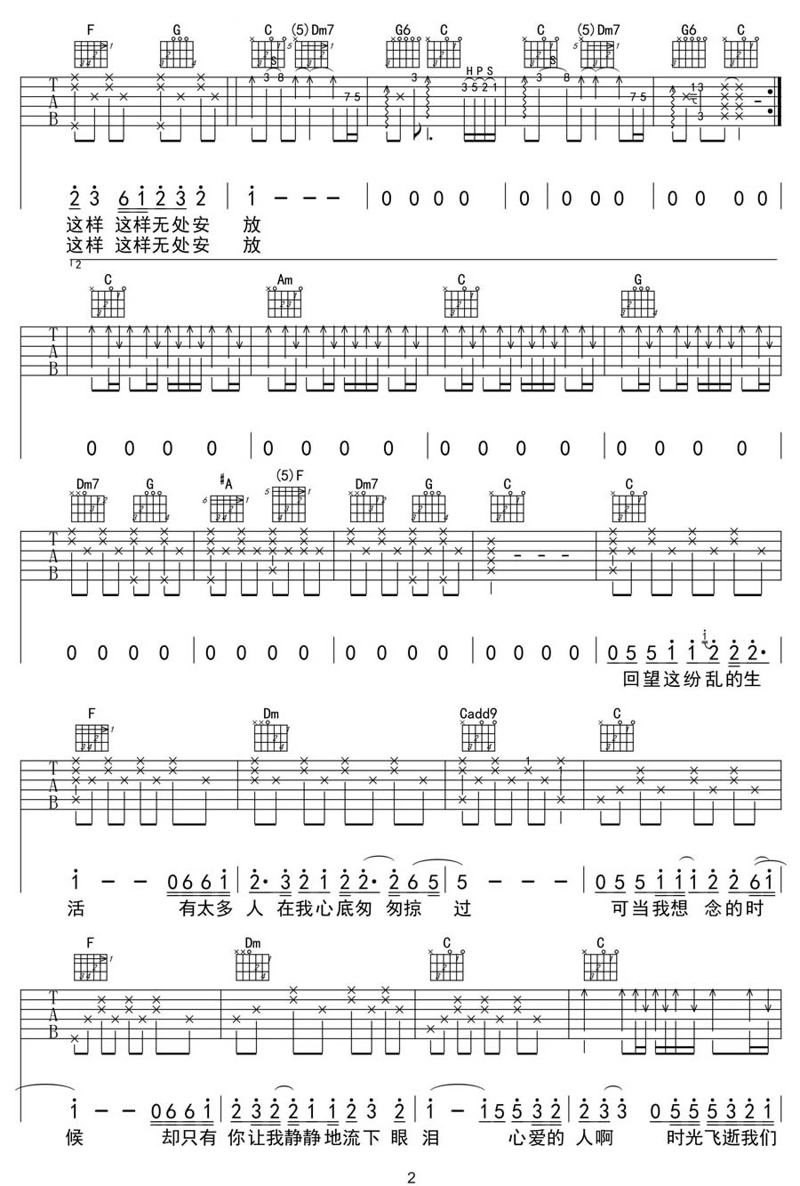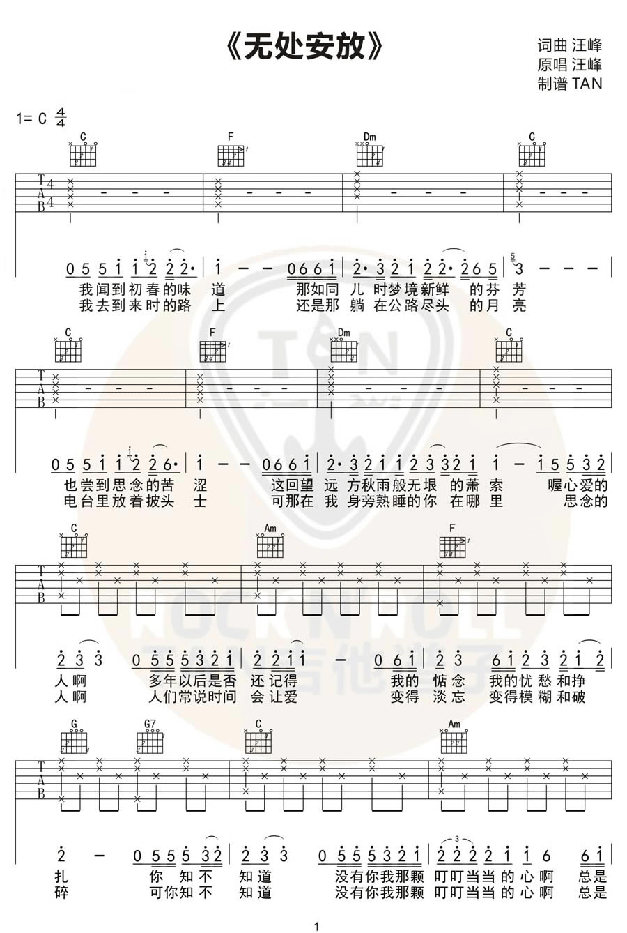 曲谱介绍: 汪峰《无处安放》吉他弹唱谱,采用C调指法编配原版,共有3张高清图谱。