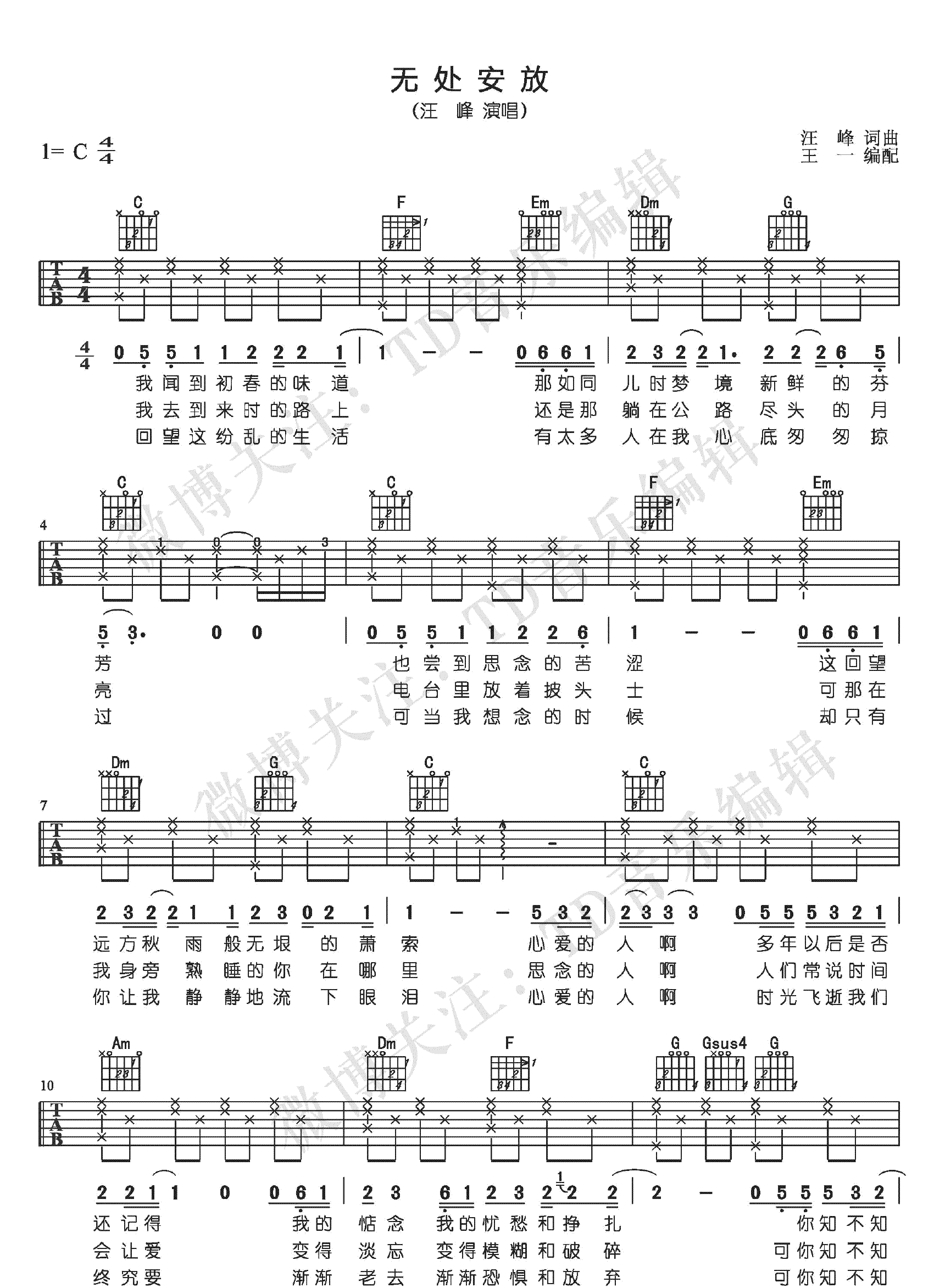 曲谱介绍: 汪峰《无处安放》吉他弹唱谱,采用C调指法编配,共有2张高清图谱,免翻页排版设计。