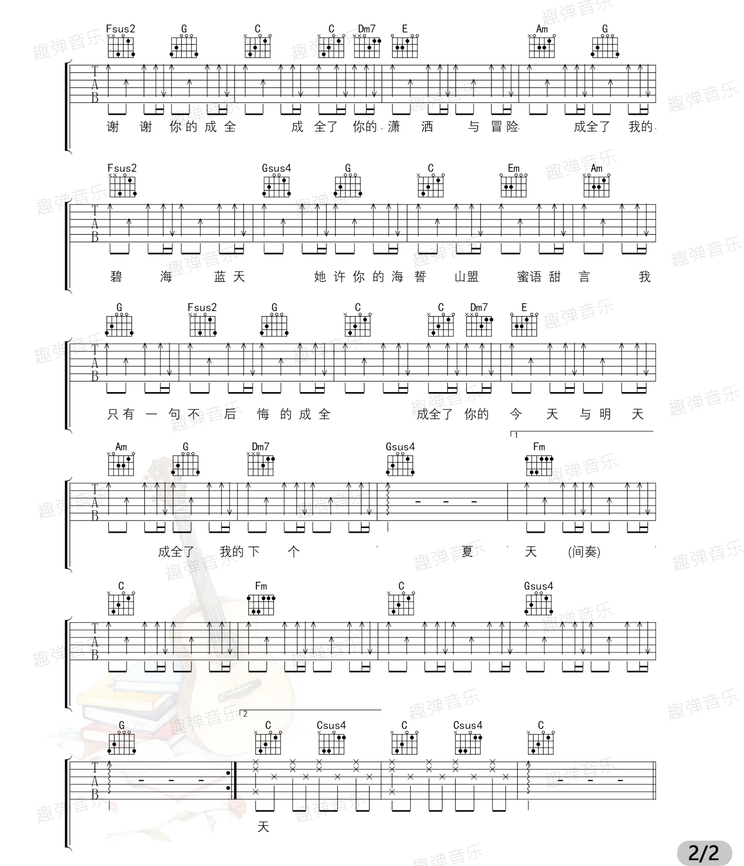 曲谱介绍: 林宥嘉《成全》吉他弹唱谱,采用C调指法编配原版,共有2张高清图谱,免翻页排版设计。