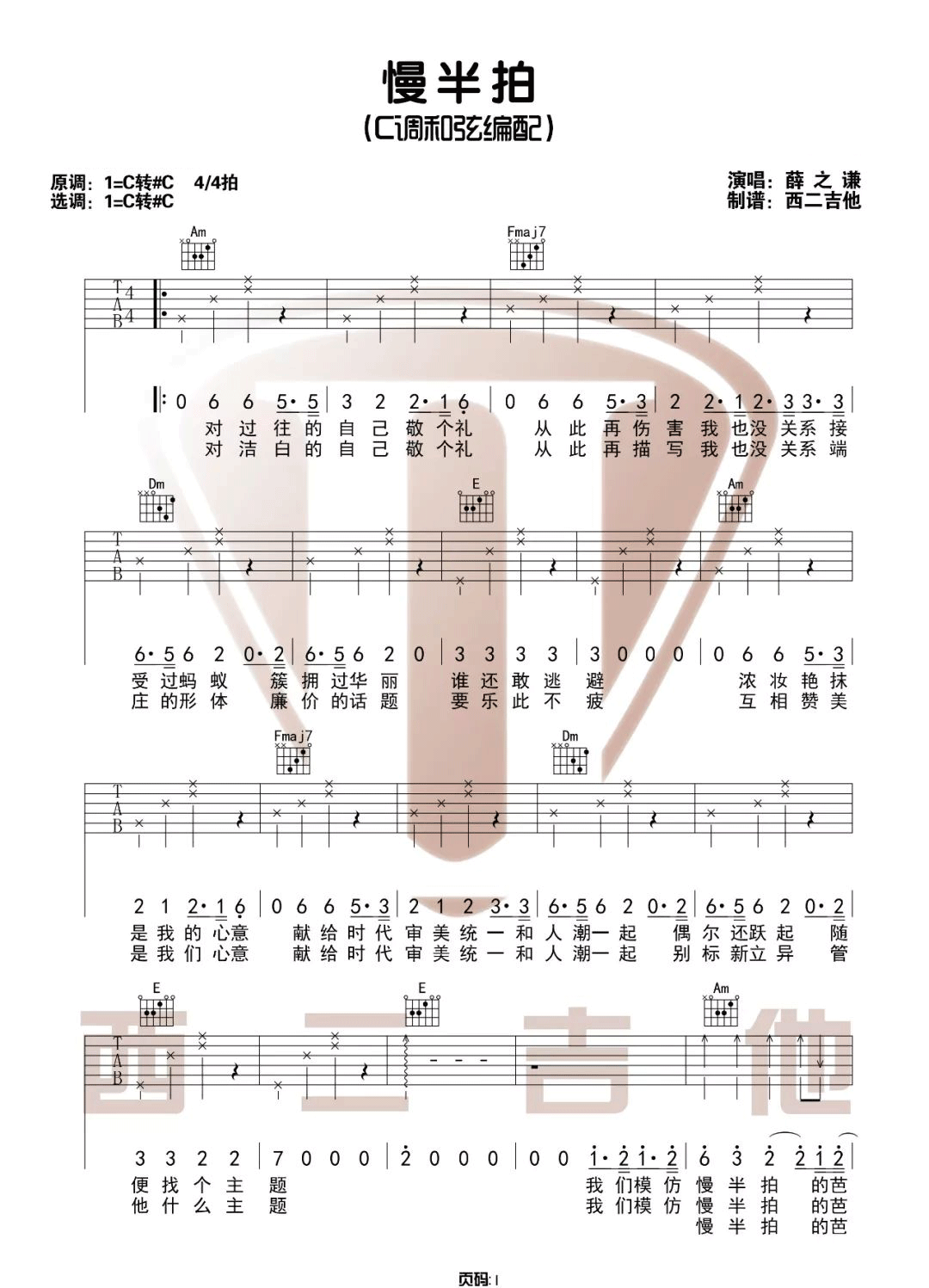 曲谱介绍: 薛之谦《慢半拍》吉他弹唱谱,采用C调指法编配,共有4张高清图谱。