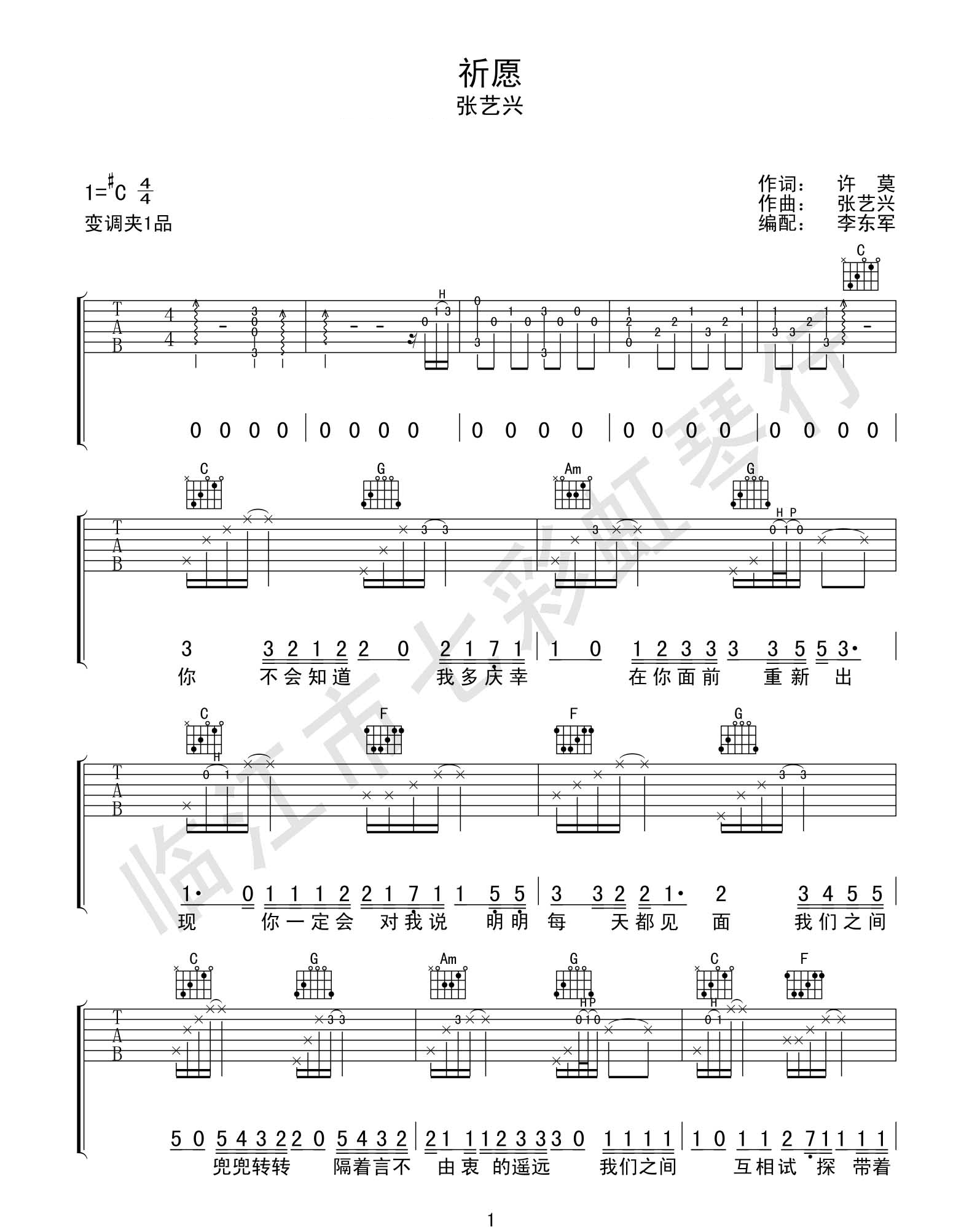 曲谱介绍: 张艺兴《祈愿》吉他弹唱谱,采用C调指法编配原版,共有3张高清图谱。