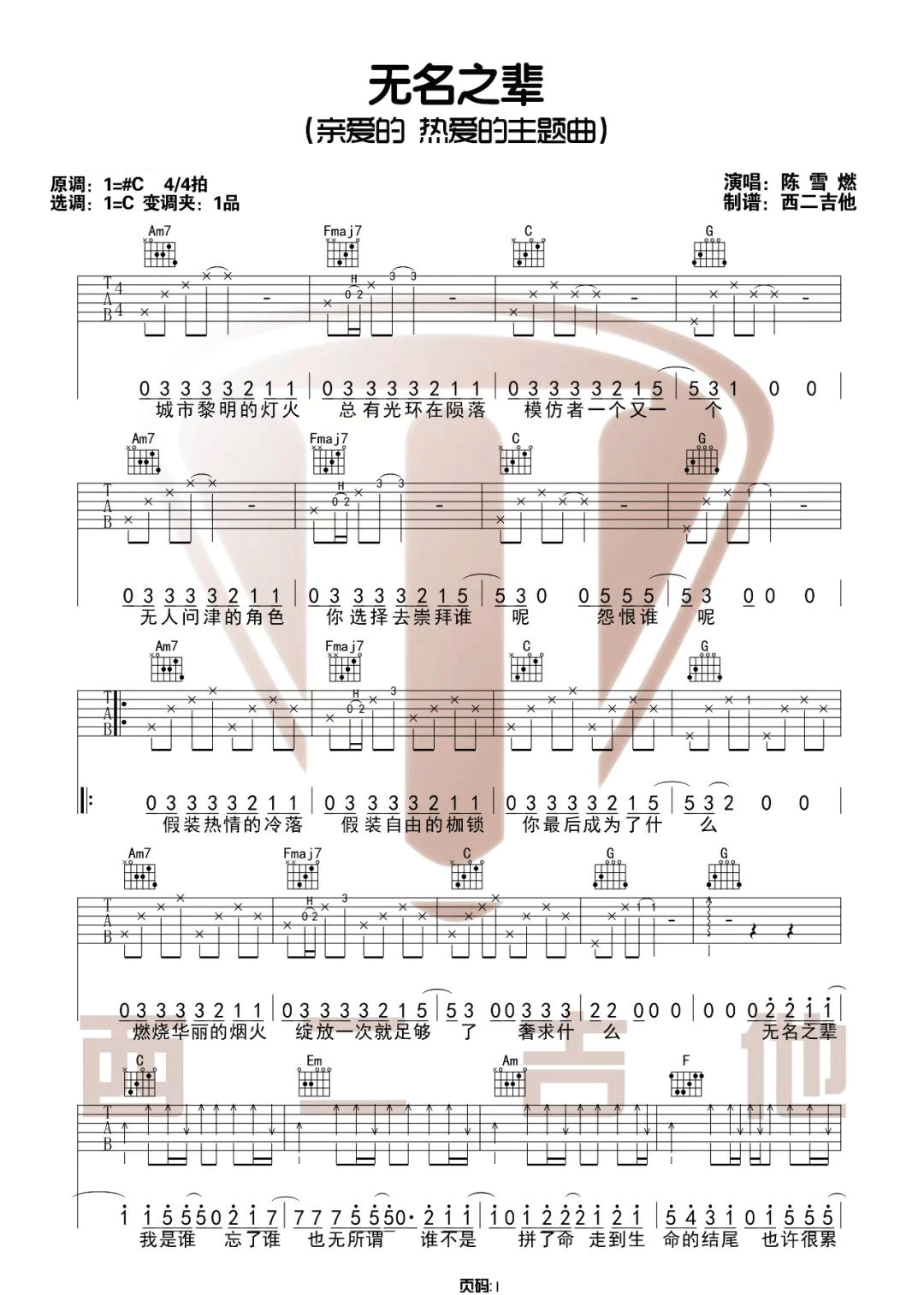 曲谱介绍: 陈雪燃《无名之辈》吉他弹唱谱,采用C调指法编配原版,共有3张高清图谱。