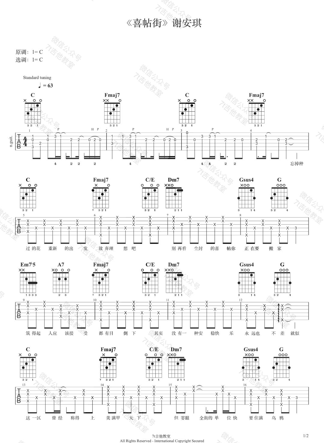 曲谱介绍: 谢安琪《喜帖街》吉他弹唱谱,采用C调指法编配原版,共有2张高清图谱,免翻页排版设计。