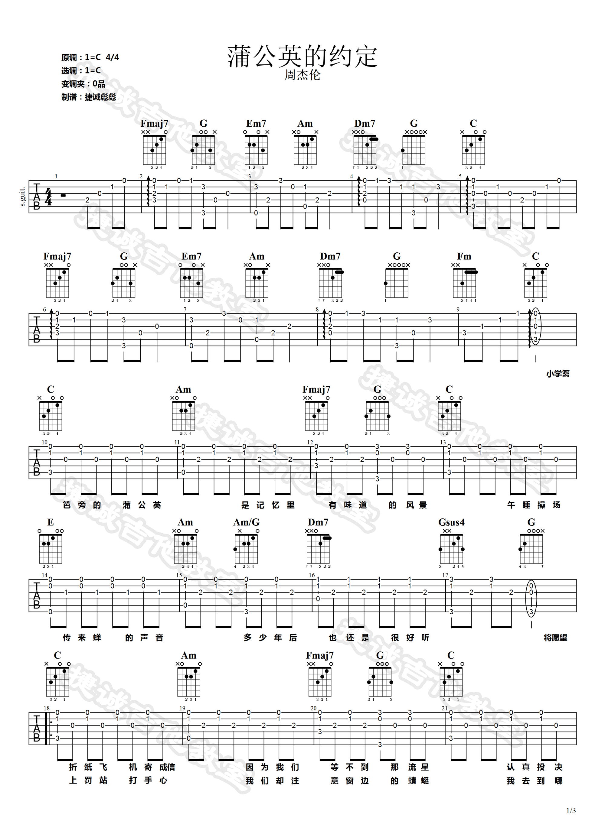 曲谱介绍: 周杰伦《蒲公英的约定》吉他弹唱谱,采用C调指法编配原版,共有3张高清图谱。