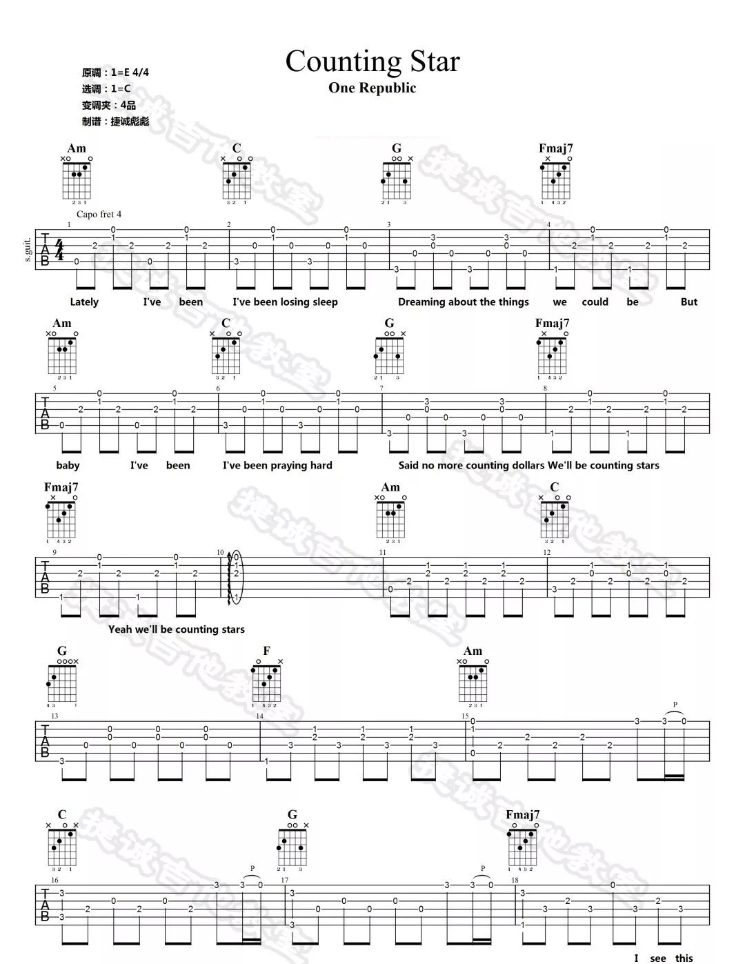 曲谱介绍: One《CountingStars》吉他弹唱谱,采用C调指法编配原版,共有4张高清图谱。
