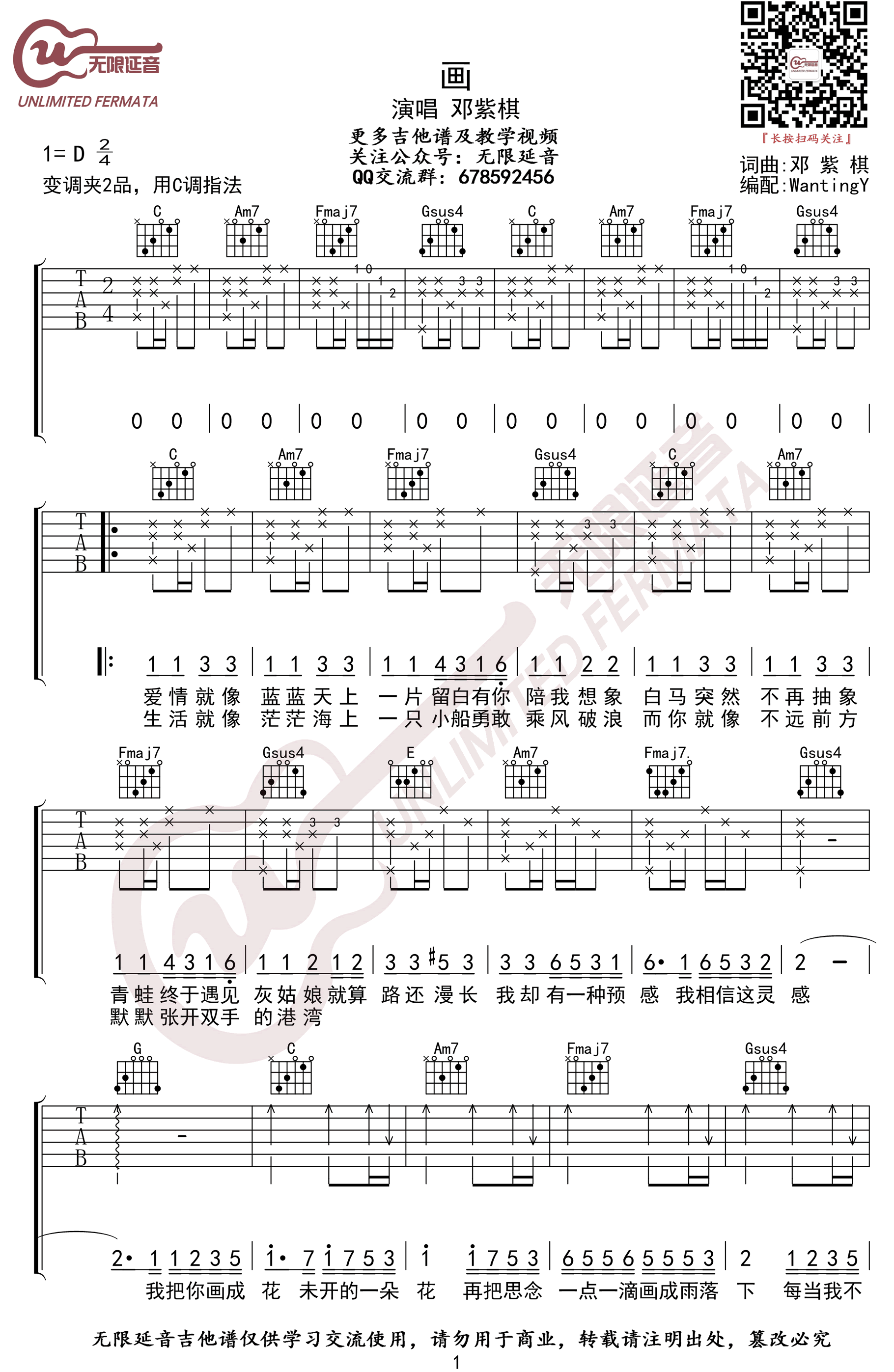 曲谱介绍: 邓紫棋《画》吉他弹唱谱,采用C调指法编配,共有2张高清图谱,免翻页排版设计。