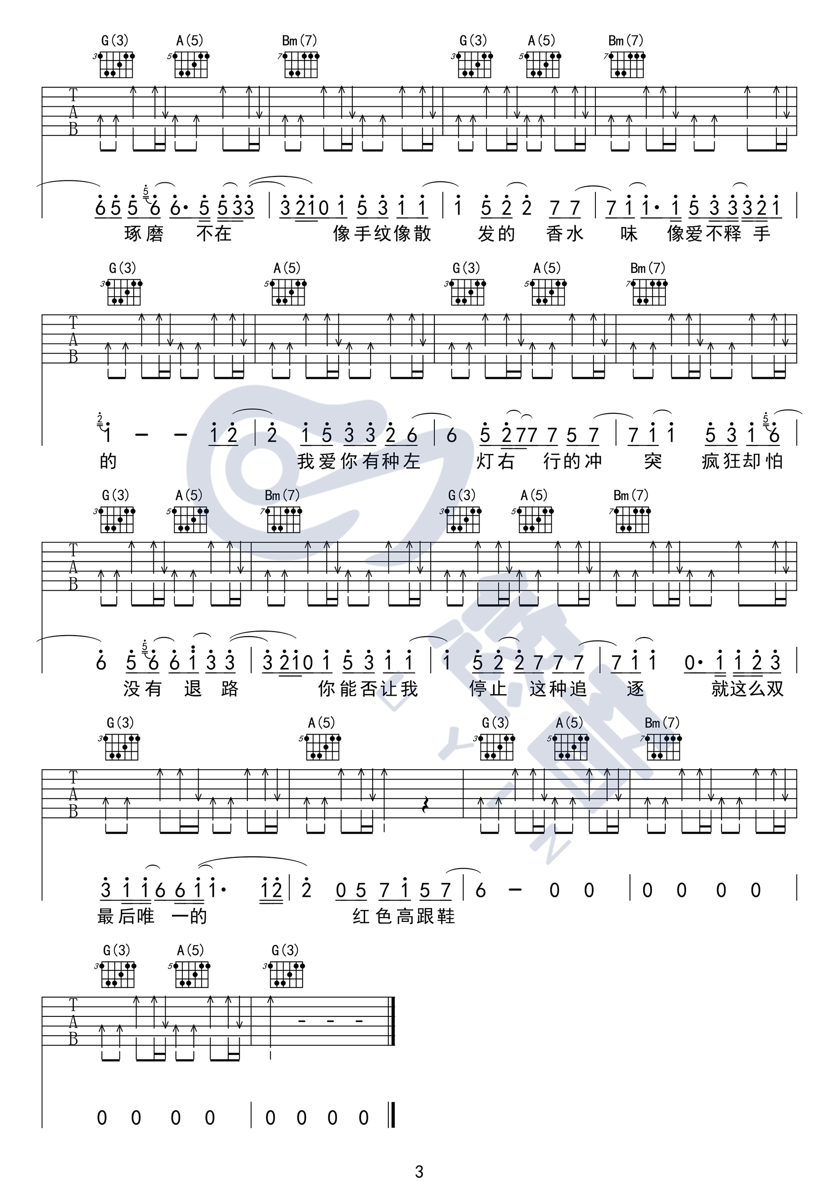 曲谱介绍: 蔡健雅《红色高跟鞋》吉他弹唱谱,采用D调指法编配原版,共有3张高清图谱。