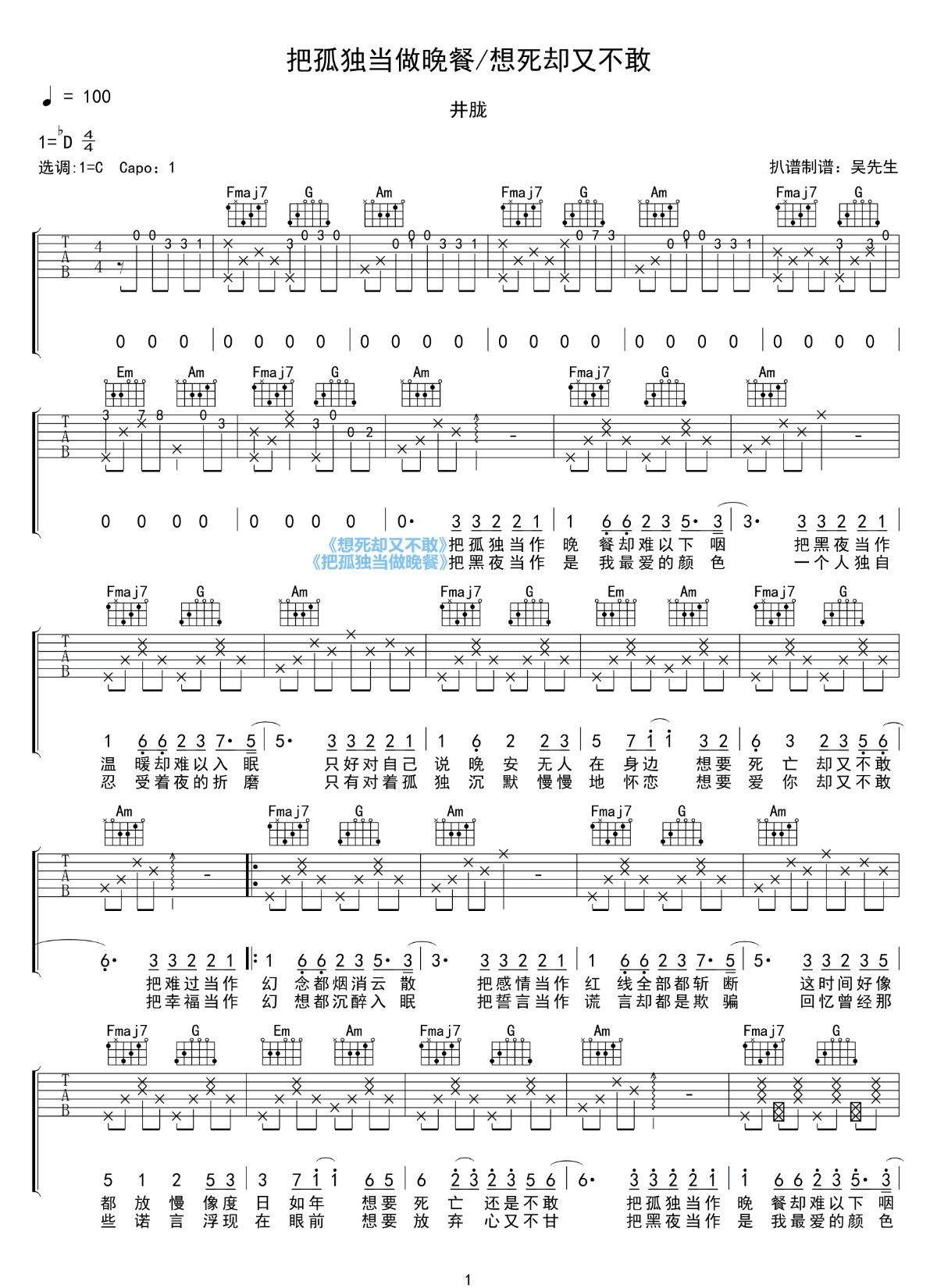 曲谱介绍: 井胧《想死却又不敢》吉他弹唱谱,采用C调指法编配原版,共有2张高清图谱,免翻页排版设计。
