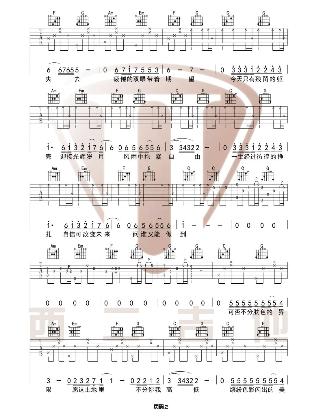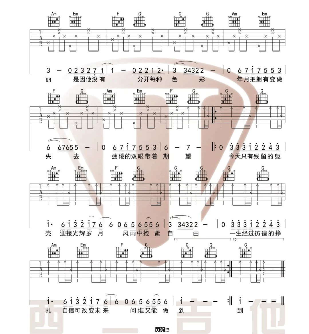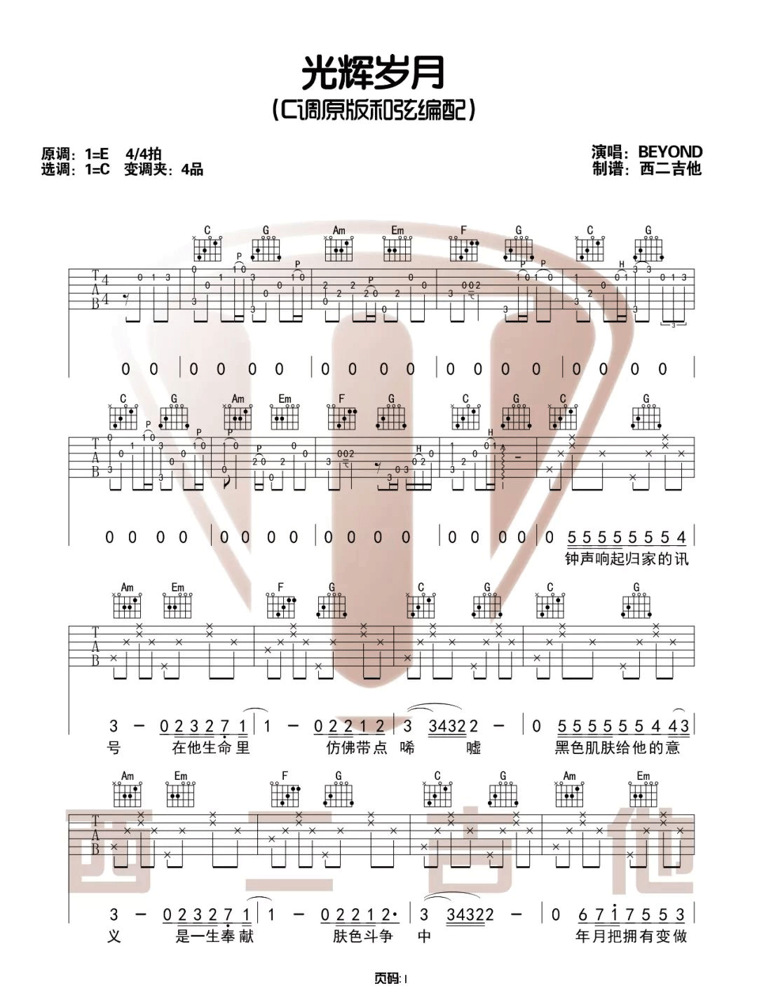 曲谱介绍: Beyond《光辉岁月》吉他弹唱谱,采用C调指法编配原版,共有3张高清图谱。