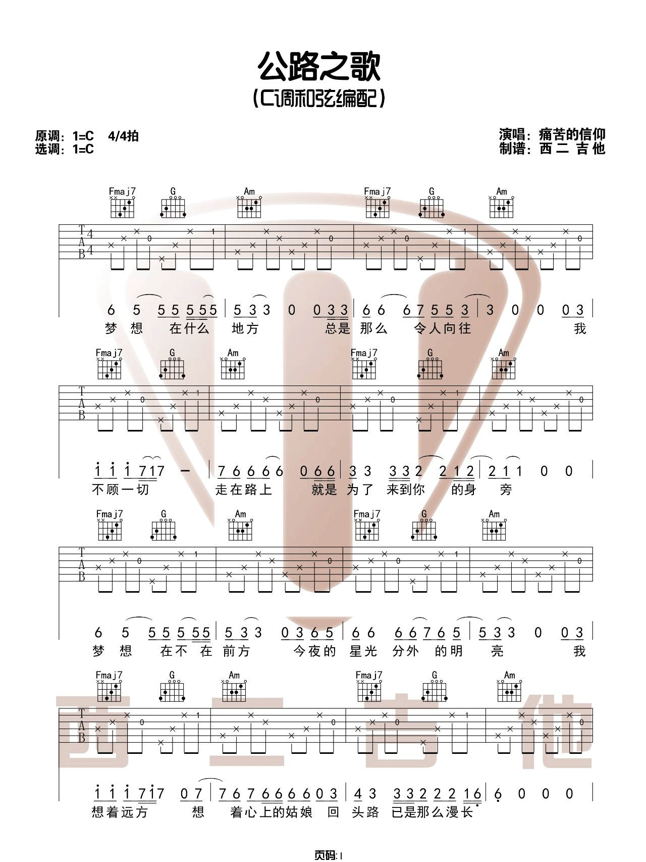 曲谱介绍: 痛仰乐队《公路之歌》吉他弹唱谱,采用C调指法编配,共有3张高清图谱。