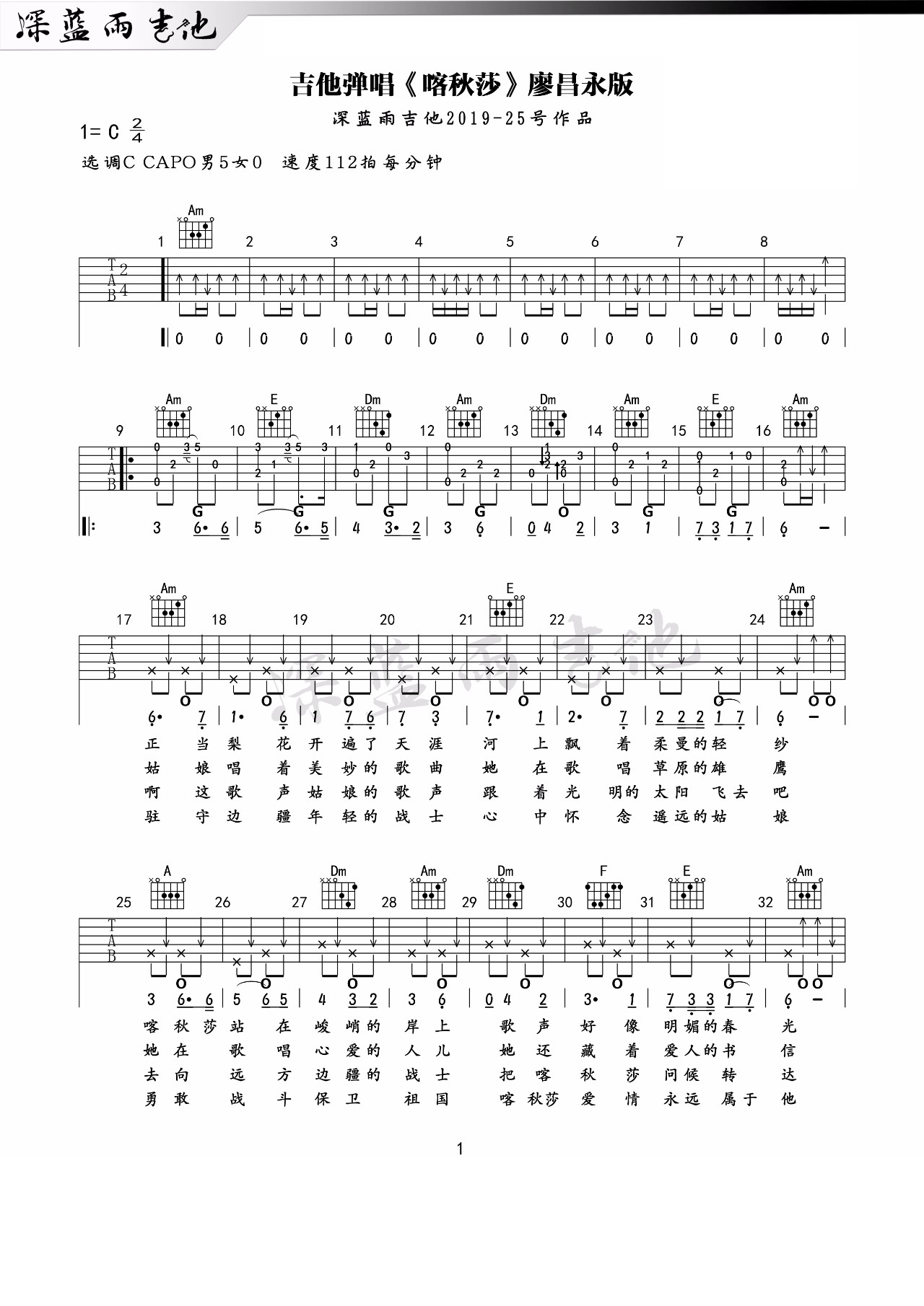 曲谱介绍: 廖昌永《喀秋莎》吉他弹唱谱,采用C调指法编配,共有2张高清图谱,免翻页排版设计。
