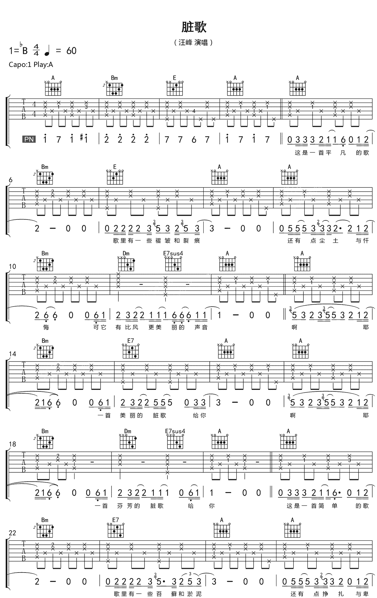 曲谱介绍: 汪峰《脏歌》吉他弹唱谱,采用A调指法编配原版,共有3张高清图谱。