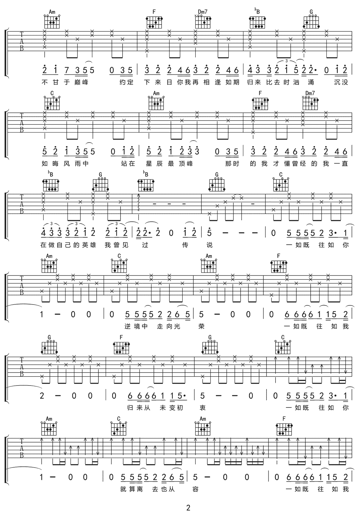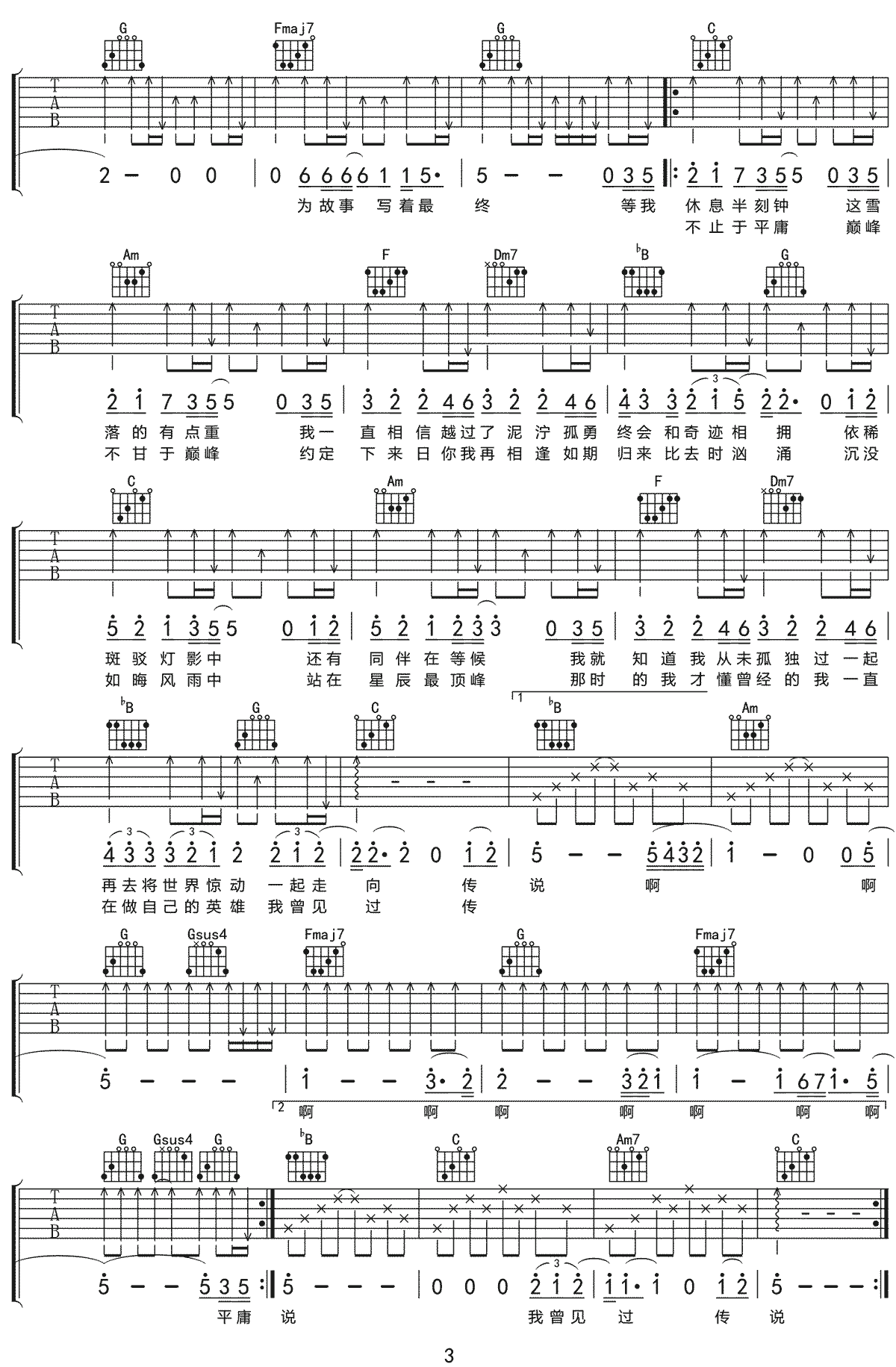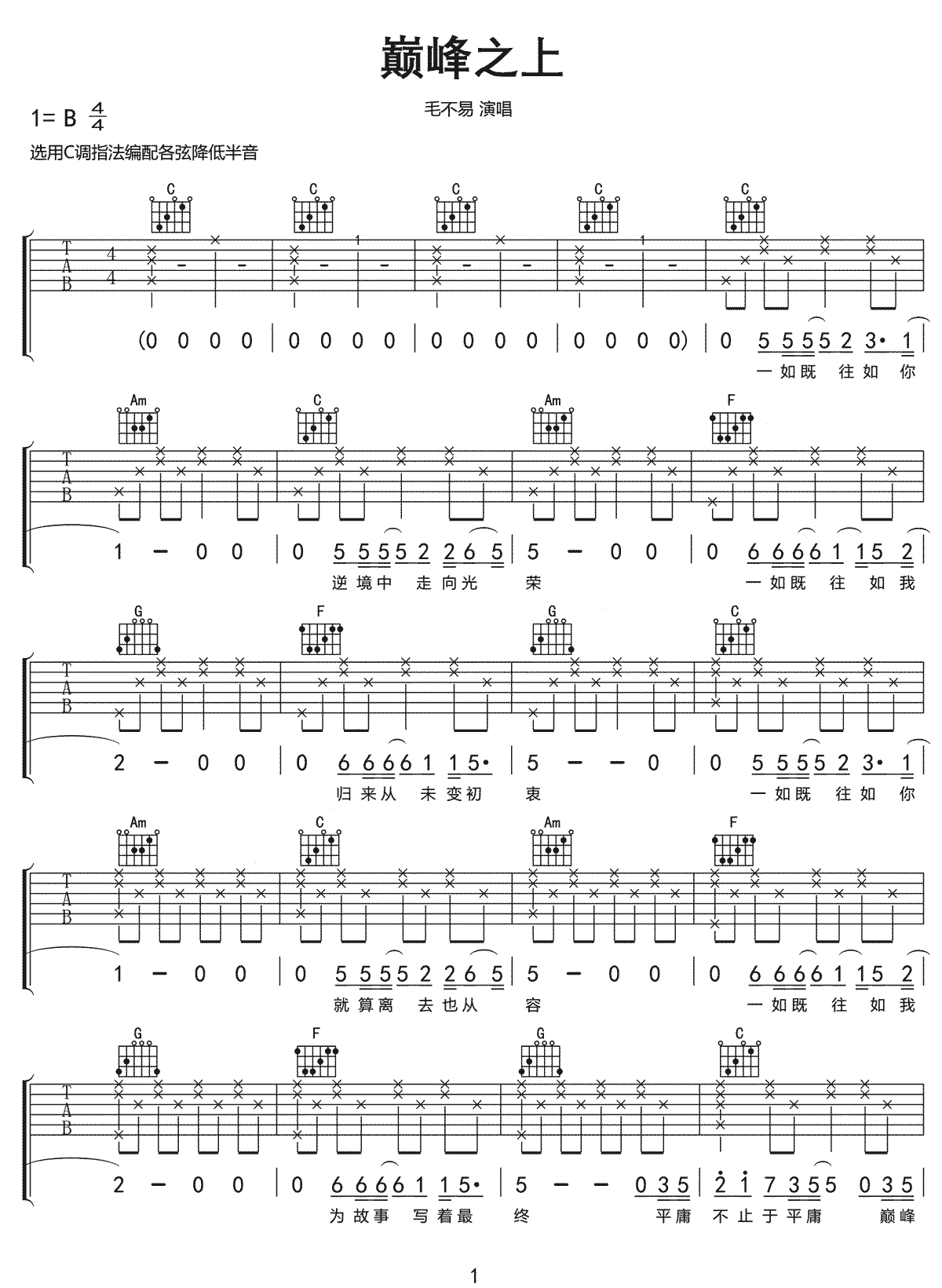 曲谱介绍: 毛不易《巅峰之上》吉他弹唱谱,采用C调指法编配原版,共有3张高清图谱。