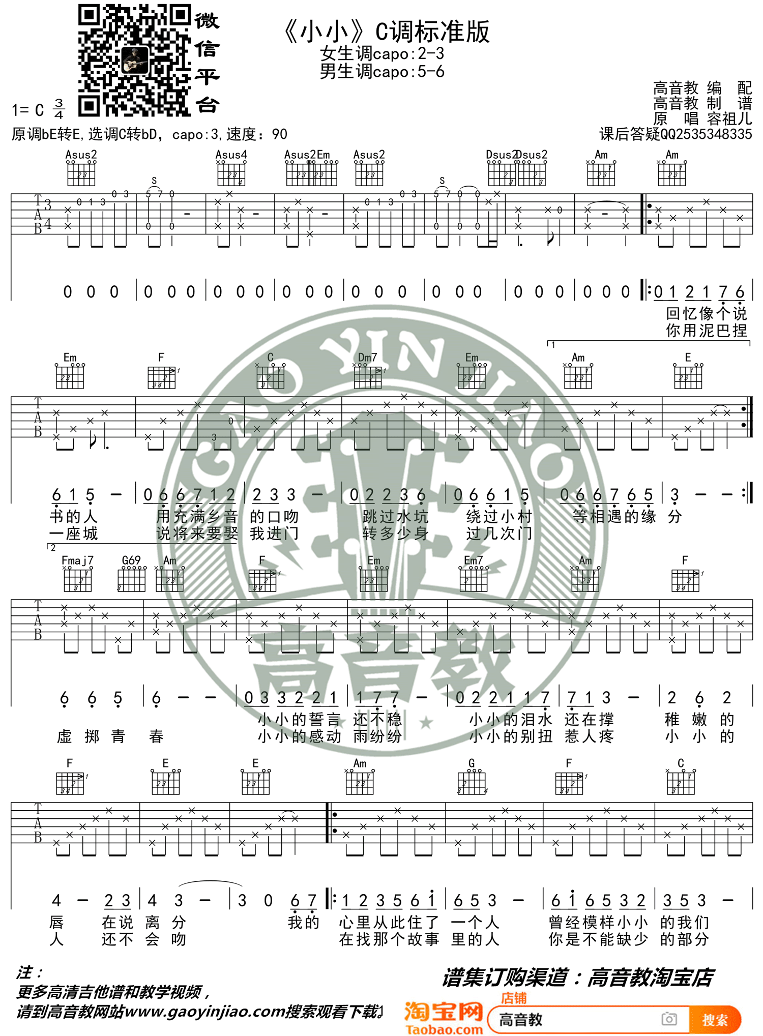 曲谱介绍: 容祖儿《小小》吉他弹唱谱,采用C调指法编配原版,共有2张高清图谱,免翻页排版设计。
