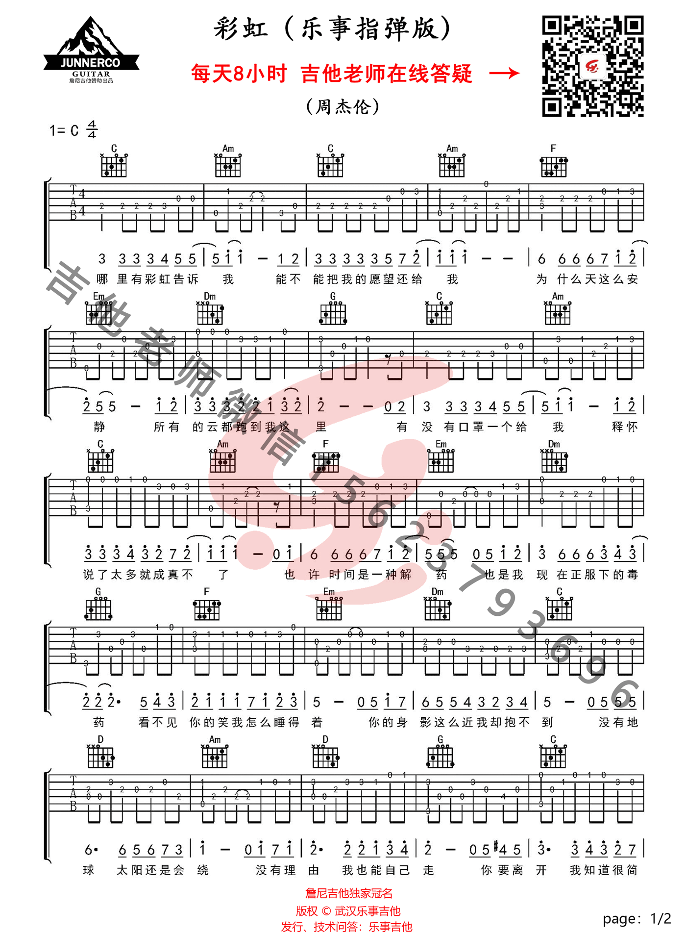 曲谱介绍: 周杰伦《彩虹》吉他独奏谱,采用C调指法编配,共有2张高清图谱,免翻页排版设计。