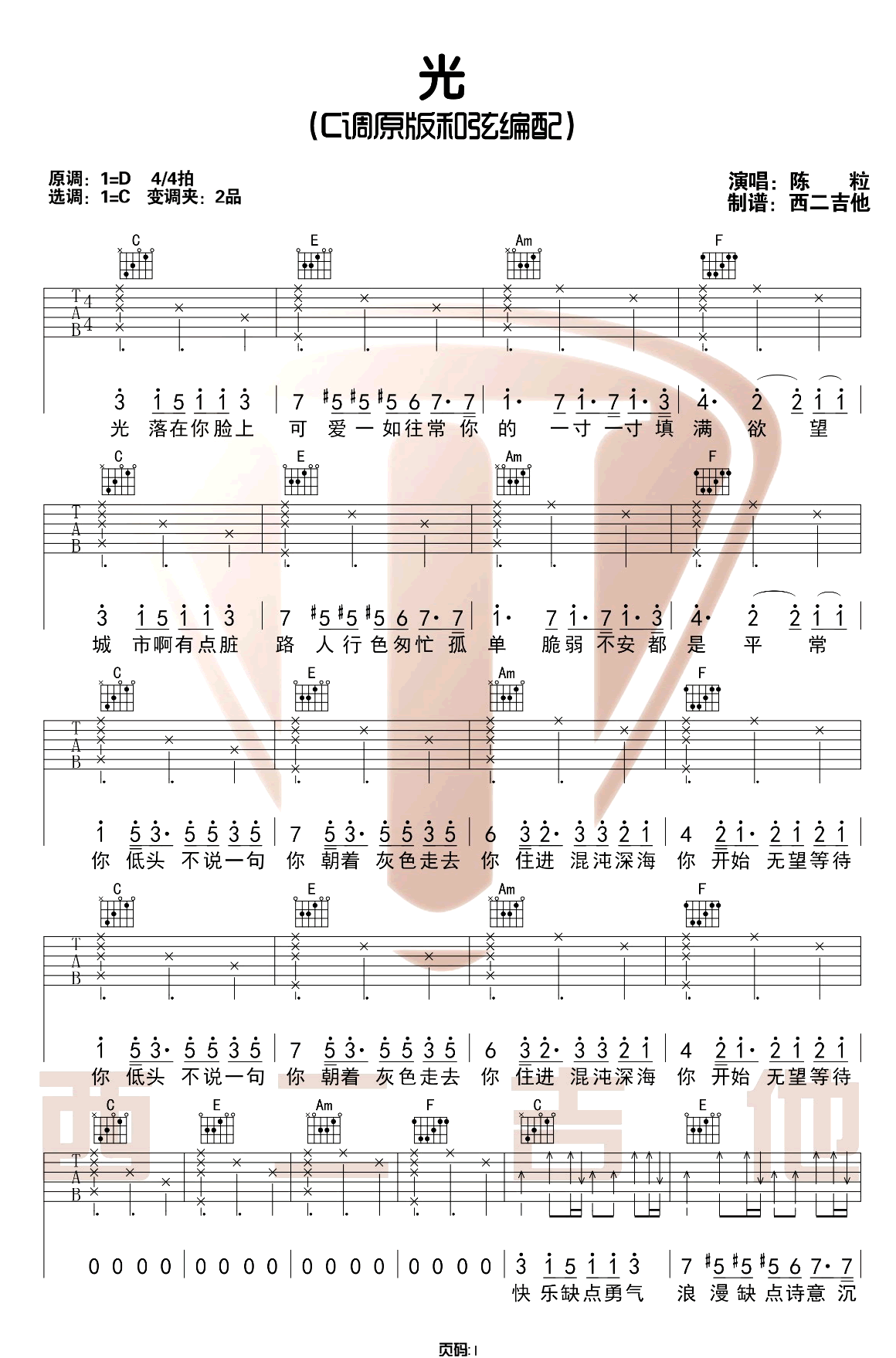 曲谱介绍: 陈粒《光》吉他弹唱谱,采用C调指法编配原版,共有2张高清图谱,免翻页排版设计。