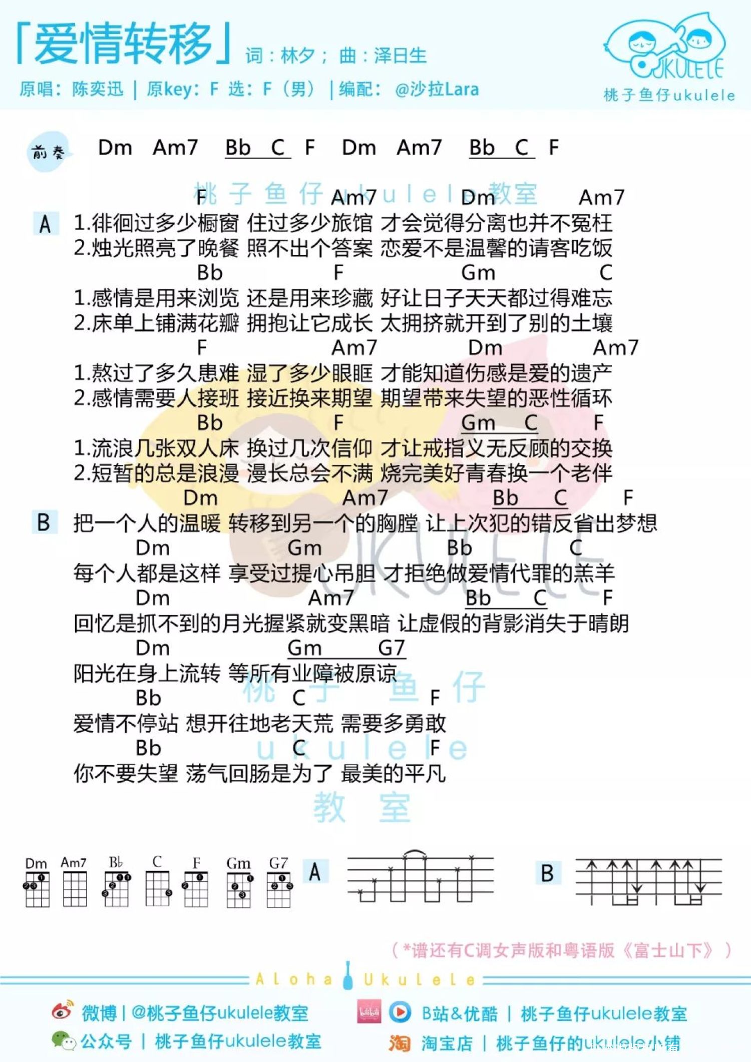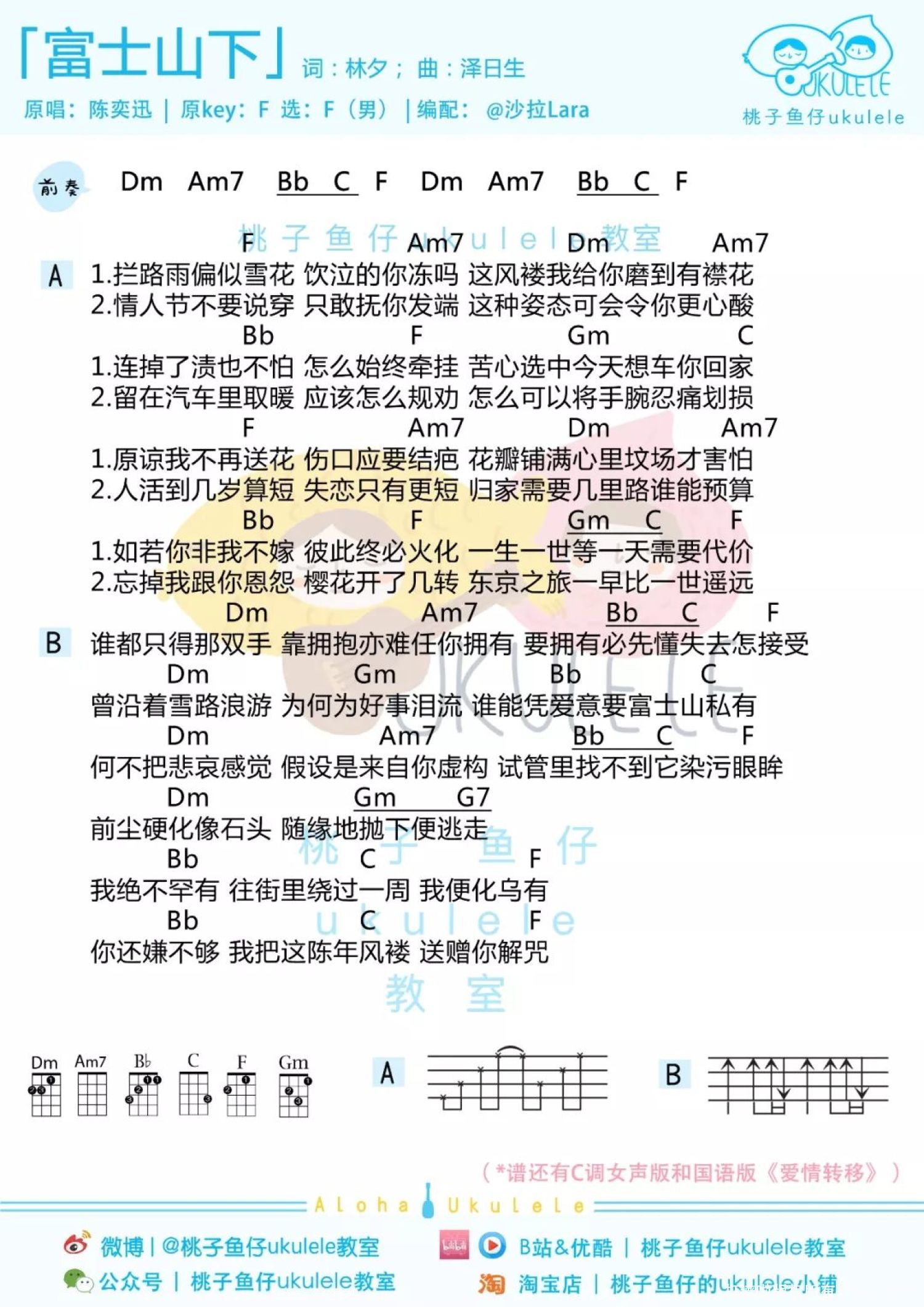曲谱介绍: 爱情转移(国语)尤克里里谱 1、女声版   2、男声版   富士山下(粤语)尤克里里谱 1、女声版   2、男声版