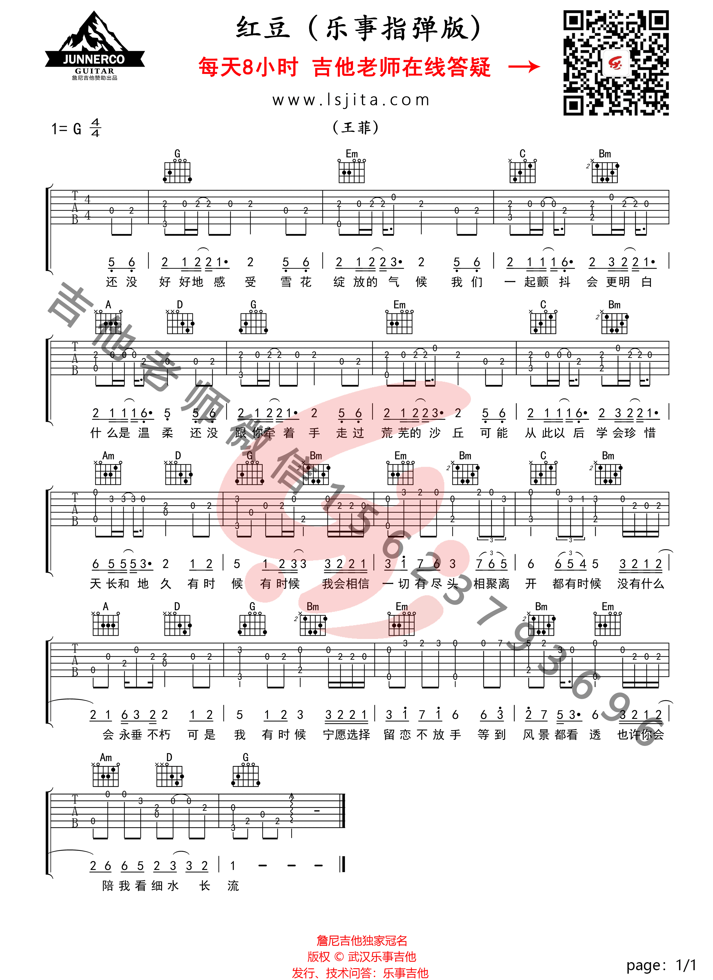 曲谱介绍: 王菲《红豆》吉他独奏谱,共有1张高清图谱,免翻页排版设计。