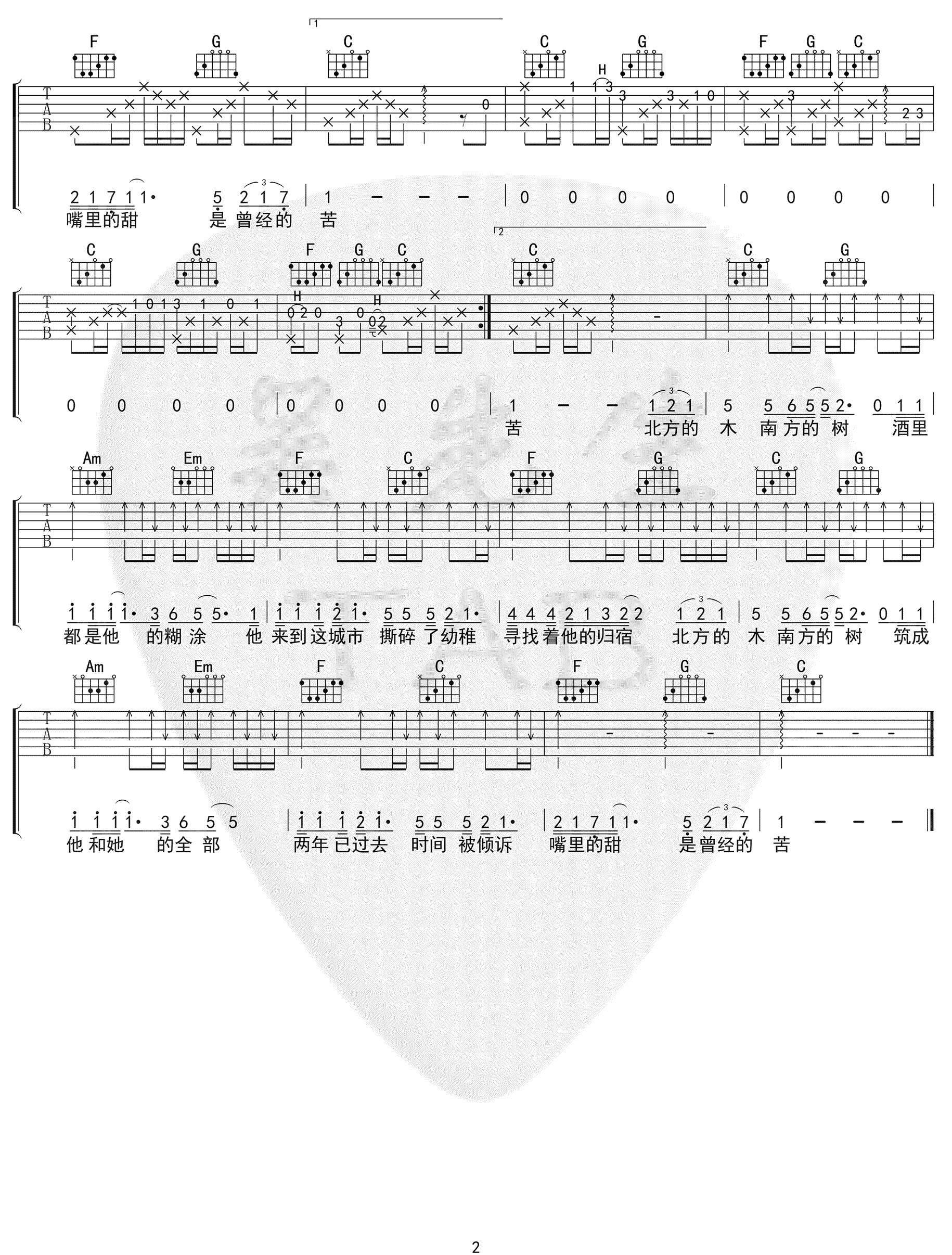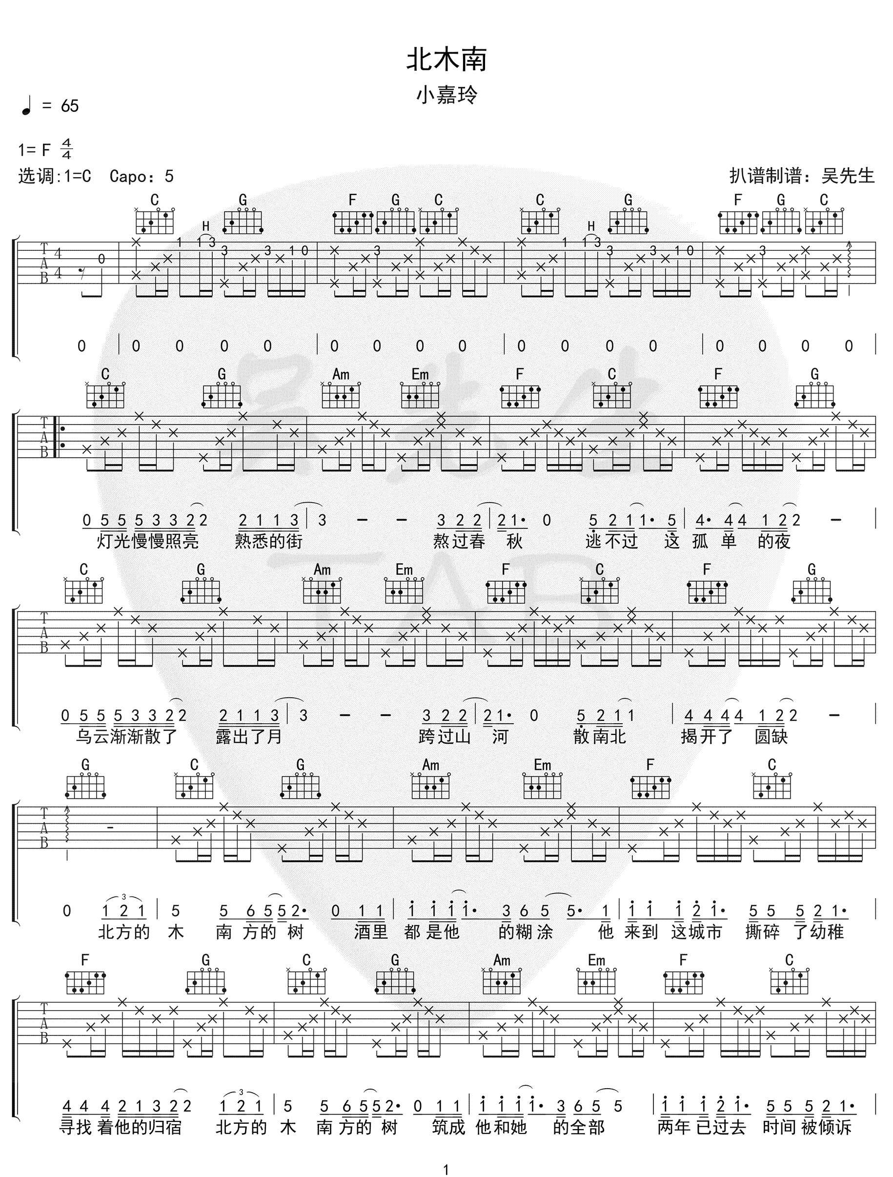 曲谱介绍: 小嘉玲《北木南》吉他弹唱谱,采用C调指法编配原版,共有2张高清图谱,免翻页排版设计。