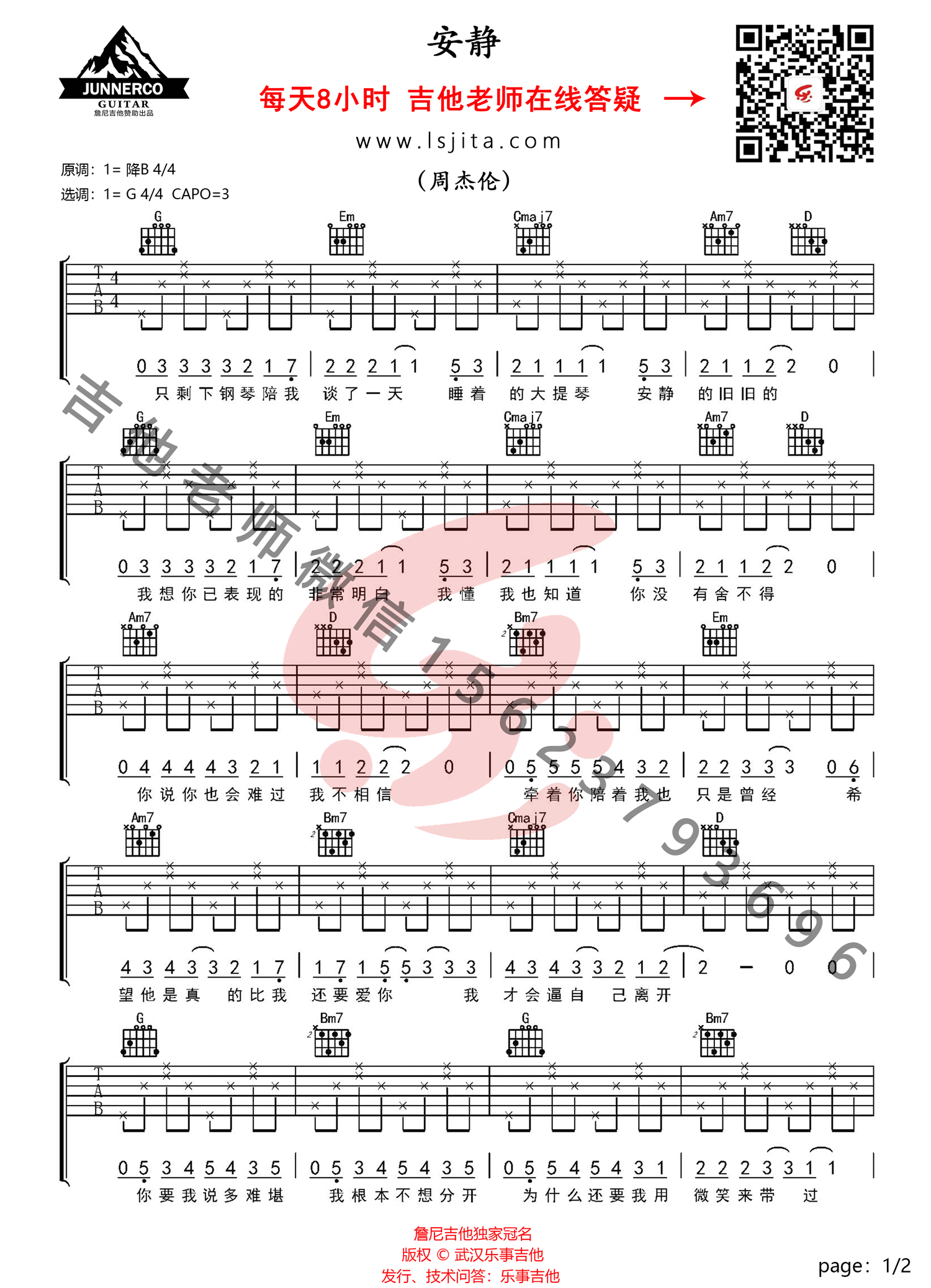 曲谱介绍: 周杰伦《安静》吉他独奏谱,共有2张高清图谱,免翻页排版设计。