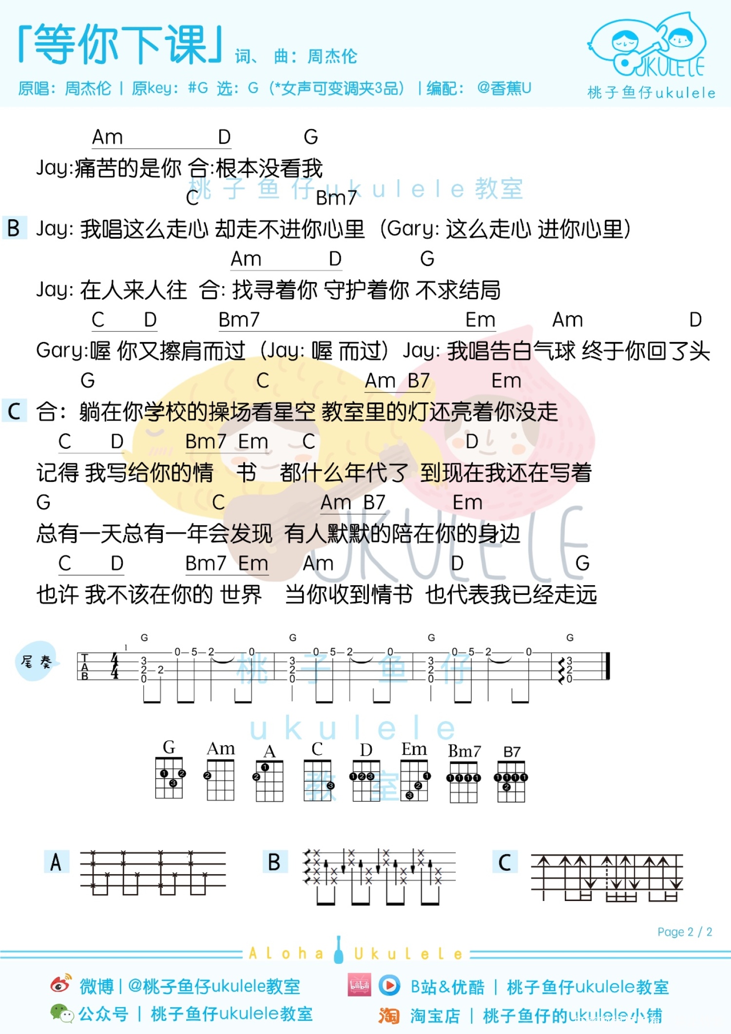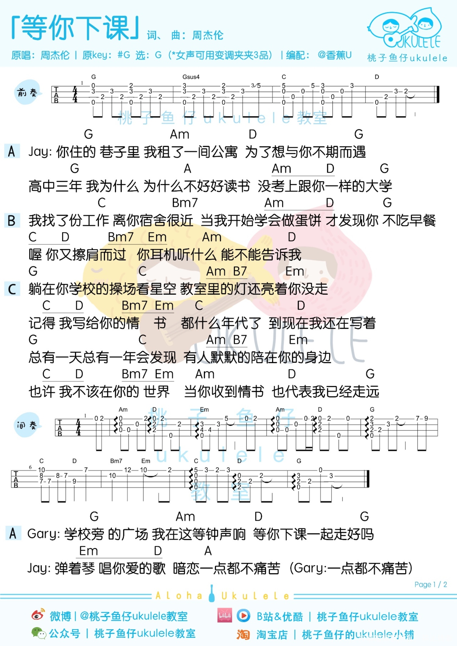 曲谱介绍: 谢谢陪伴了我们18年的周杰伦 现在不惑将至的杰伦有一个温柔美丽的妻子 有两个可爱的孩子、幸福的家庭 每年的演唱会还是会有大家陪着他一起合唱 之前在五月天的演唱会上,杰伦跟大家自嘲:现在大家都说我是你们的青春,其实,心里还是会有点小失落的。 “因为,青春这个东西很短啊 我是希望被你们喜欢一辈子的” (我们当然会喜欢你一辈子的! )   尤克里里弹唱演示   教学视频   等你下课 尤克里里谱 要听妈妈的话 好好读书 才能和喜欢的TA 一起上同一个大学 一起好好吃早餐 一起弹琴:))
