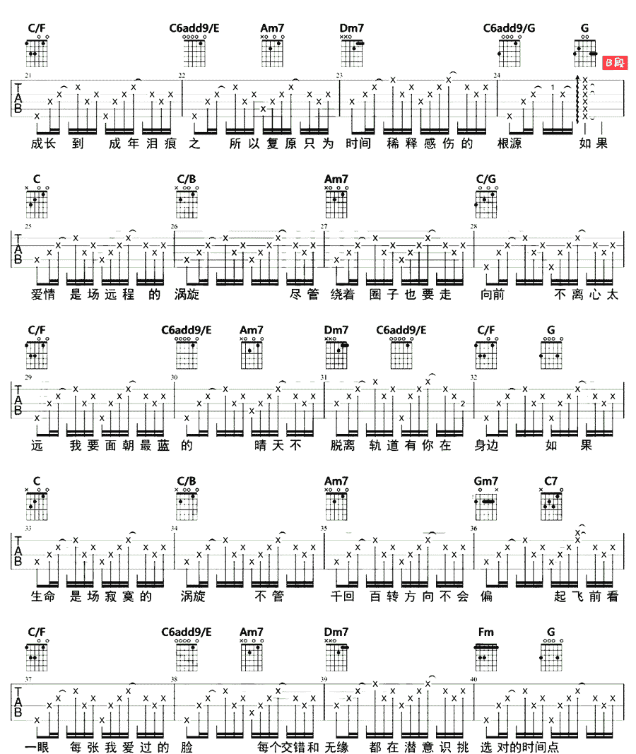 曲谱介绍: 林俊杰《对的时间点》吉他弹唱谱,采用C调指法编配原版,共有3张高清图谱。