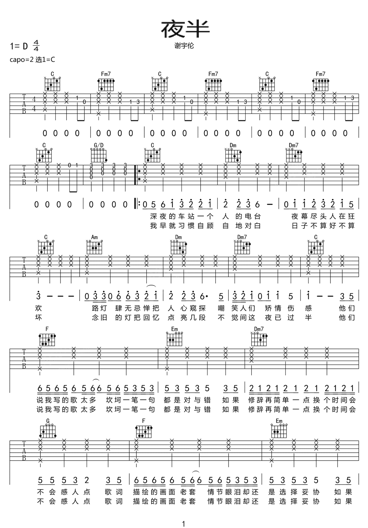 夜半吉他谱 - 谢宇伦 - C调吉他弹唱谱 - 原版