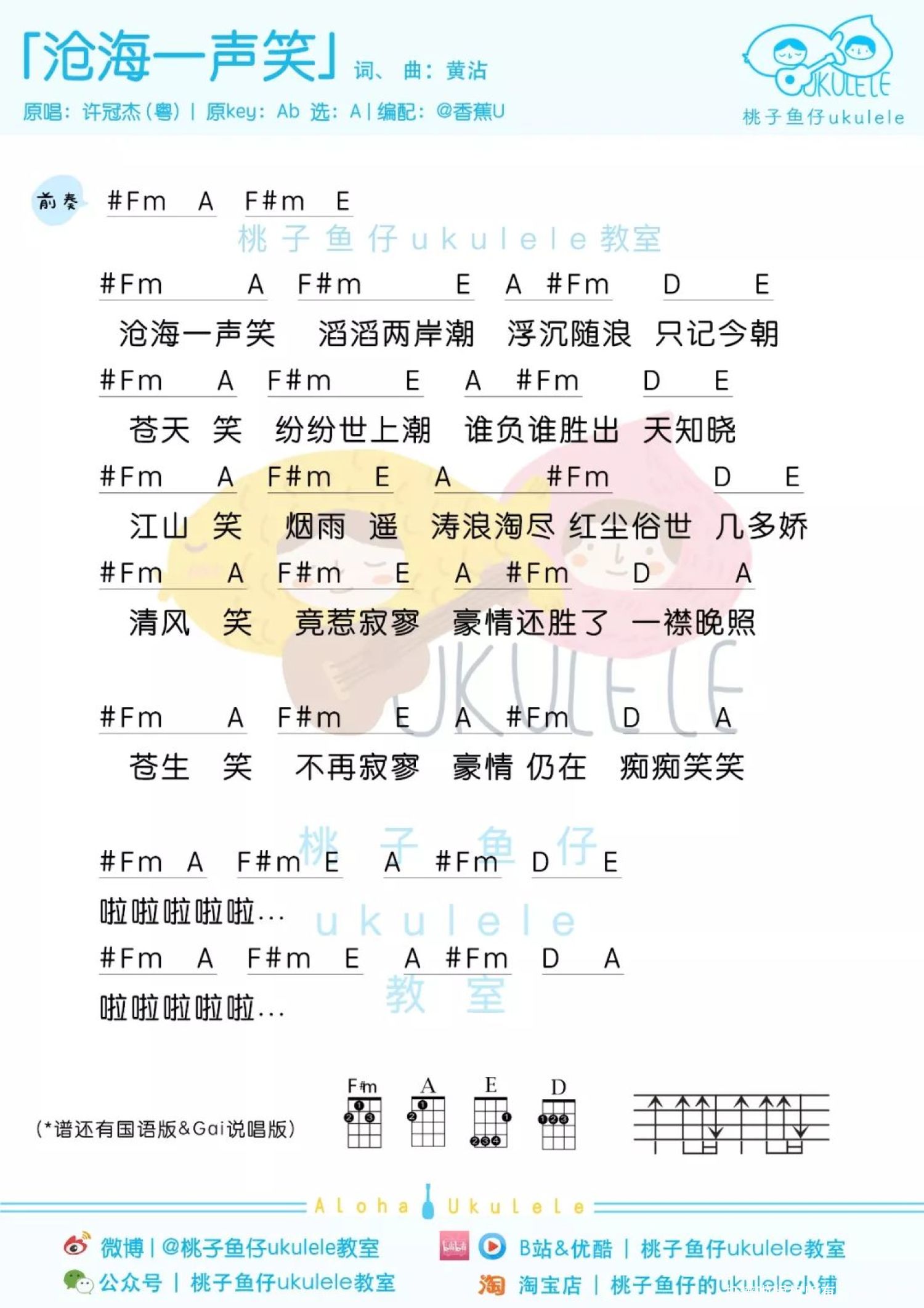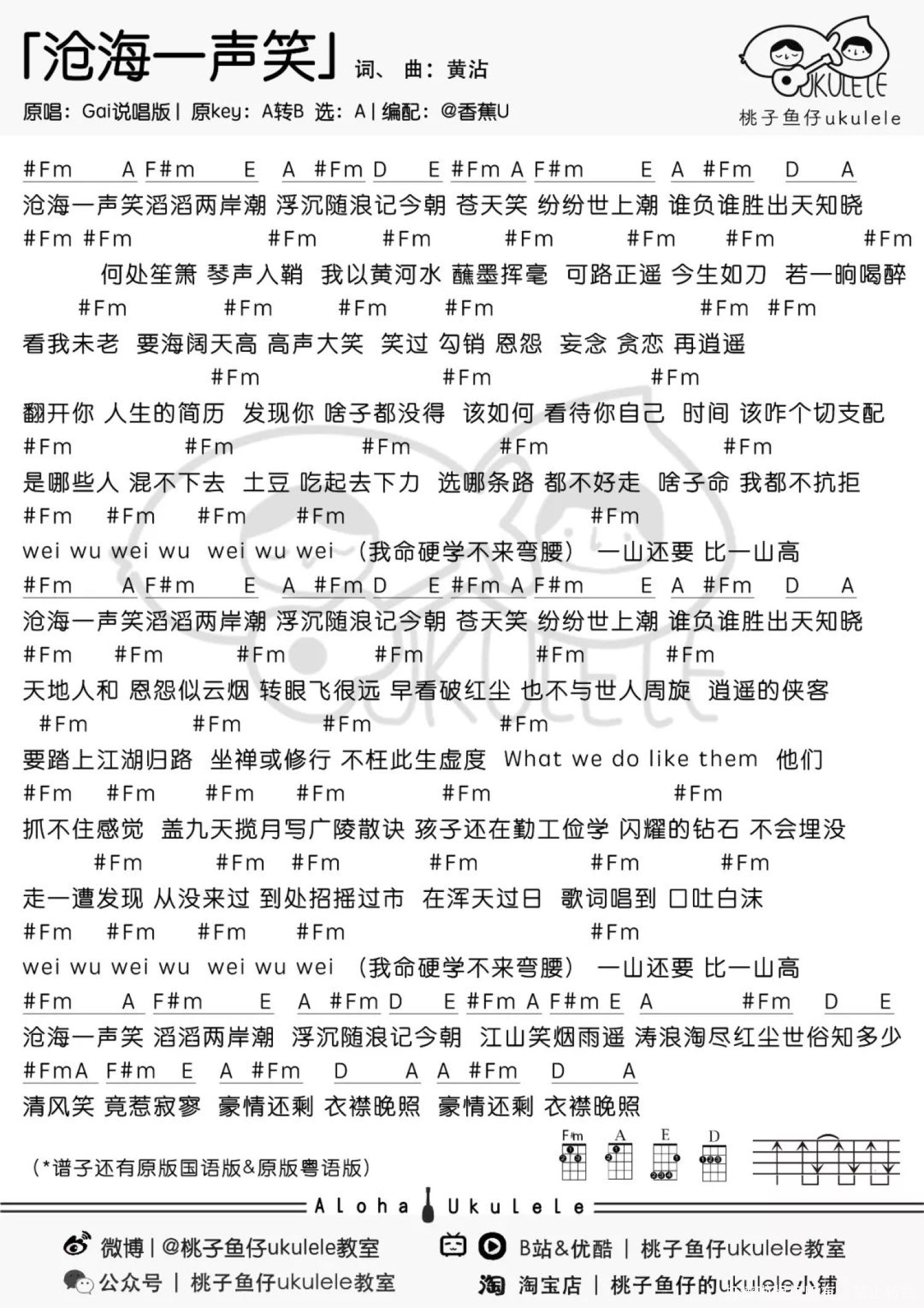 曲谱介绍: 沧海一声笑 尤克里里谱 1、GAI酷炫说唱版   2、原版国语版   3、原版粤语版 如果说黄霑的《沧海一声笑》是寂寥和狂傲的,是清风明月的独孤求败,那么出身市井的GAI爷的《沧海一声笑》则是热闹和固执的。 不同于其他版本用竹笛、古筝渲染出的仙气缭绕,GAI的《沧海一声笑》自前奏起就不断蓄积节奏势力,仅通过开口便紧紧锁住听众耳朵,配上GAi独一无二的沙哑浑厚的嗓音,琵琶配大鼓,古典加嘻哈,瞬间点燃现场,听得观众纷纷起立。 我命硬学不来弯腰 外表嚣张内里谦虚的Gai有点萌~