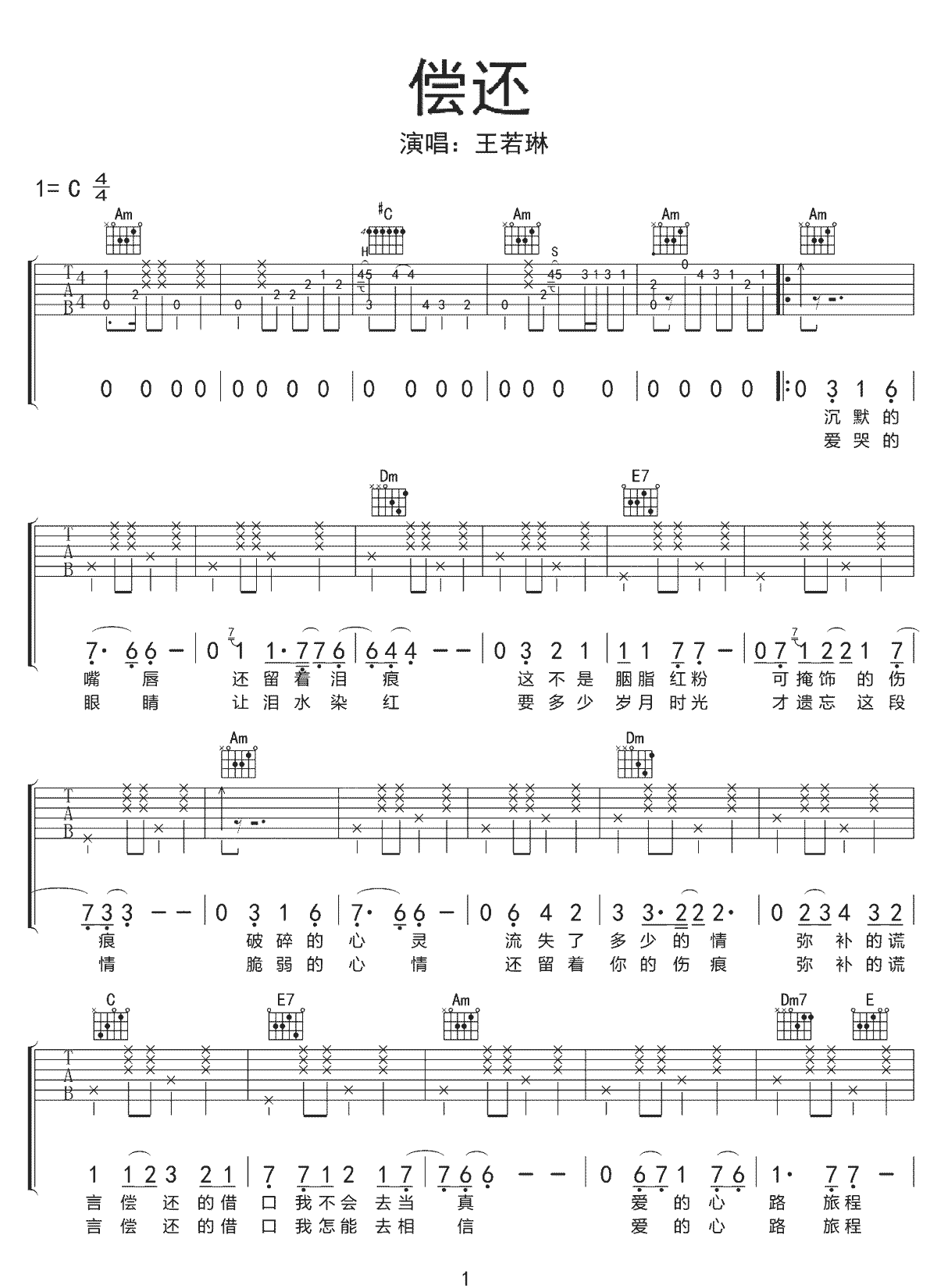 曲谱介绍: 王若琳/邓丽君《偿还》吉他弹唱谱,采用C调指法编配原版,共有2张高清图谱,免翻页排版设计。