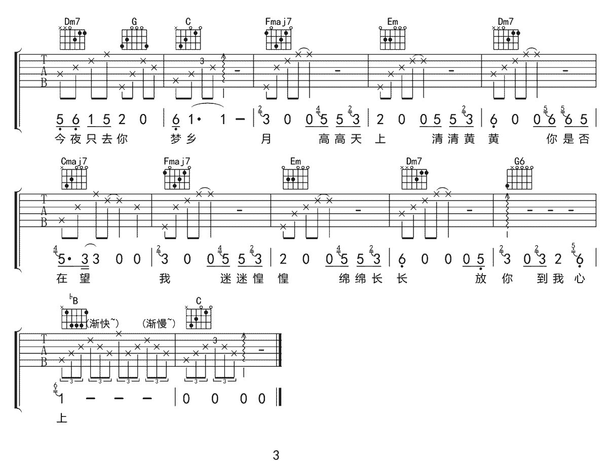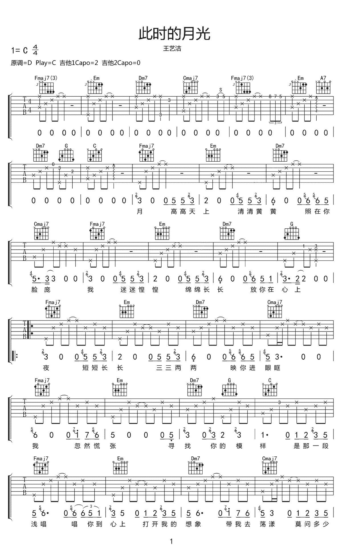 曲谱介绍: 王艺洁《此时的月光》吉他弹唱谱,采用C调指法编配原版,共有3张高清图谱。