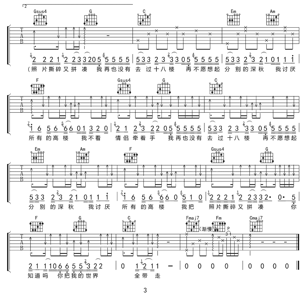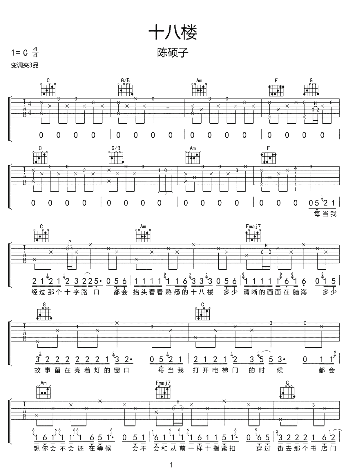 曲谱介绍: 陈硕子《十八楼》吉他弹唱谱,采用C调指法编配原版,共有3张高清图谱。