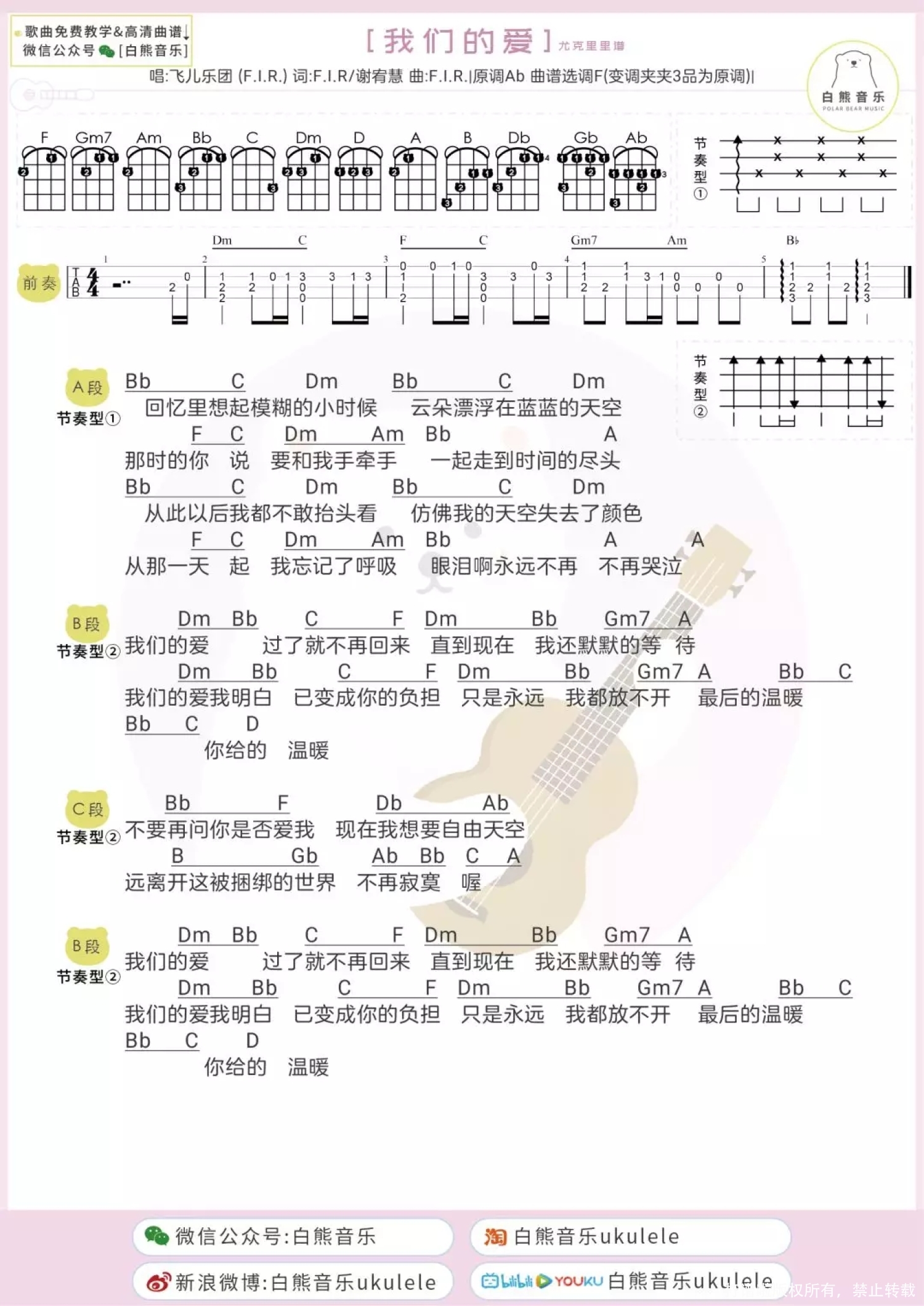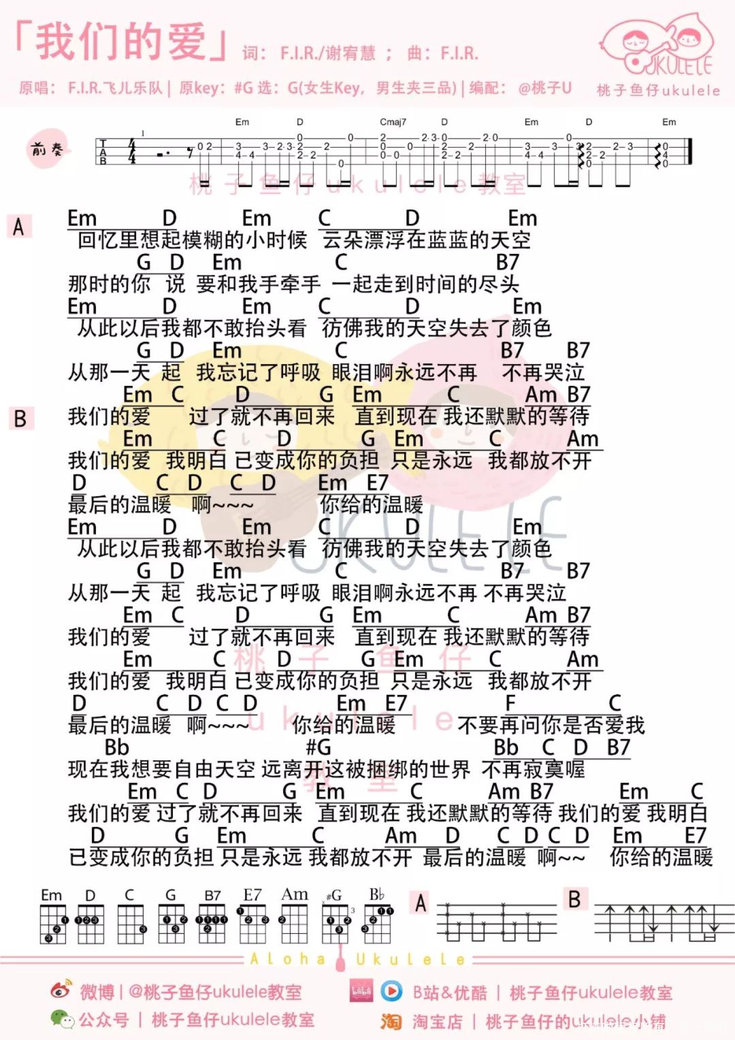 曲谱介绍: 我们的爱ukulele弹唱教学|@草帽呀 我们的爱ukulele谱 F调   《我们的爱》尤克里里谱G调   我们的爱吉他谱