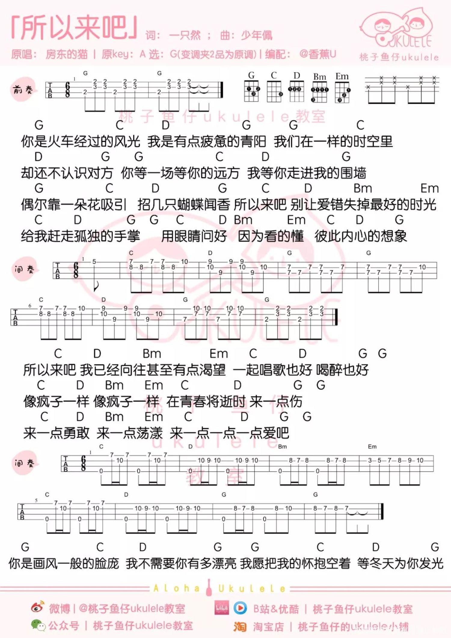 曲谱介绍: 我们在一样的时空里 却还不认识对方 —BY:房东的猫《所以来吧》   尤克里里弹唱   弹唱教学   《所以来吧》尤克里里谱