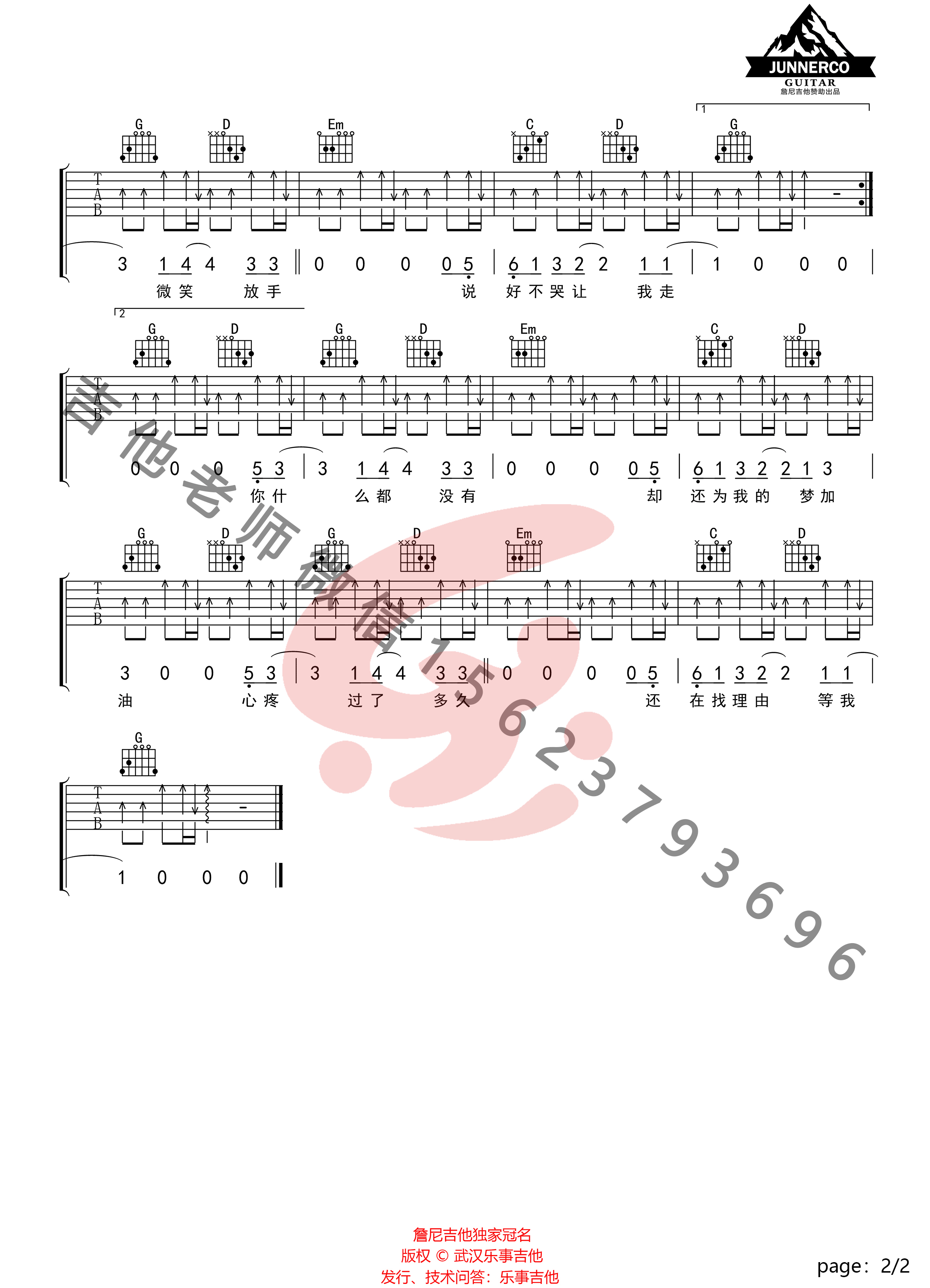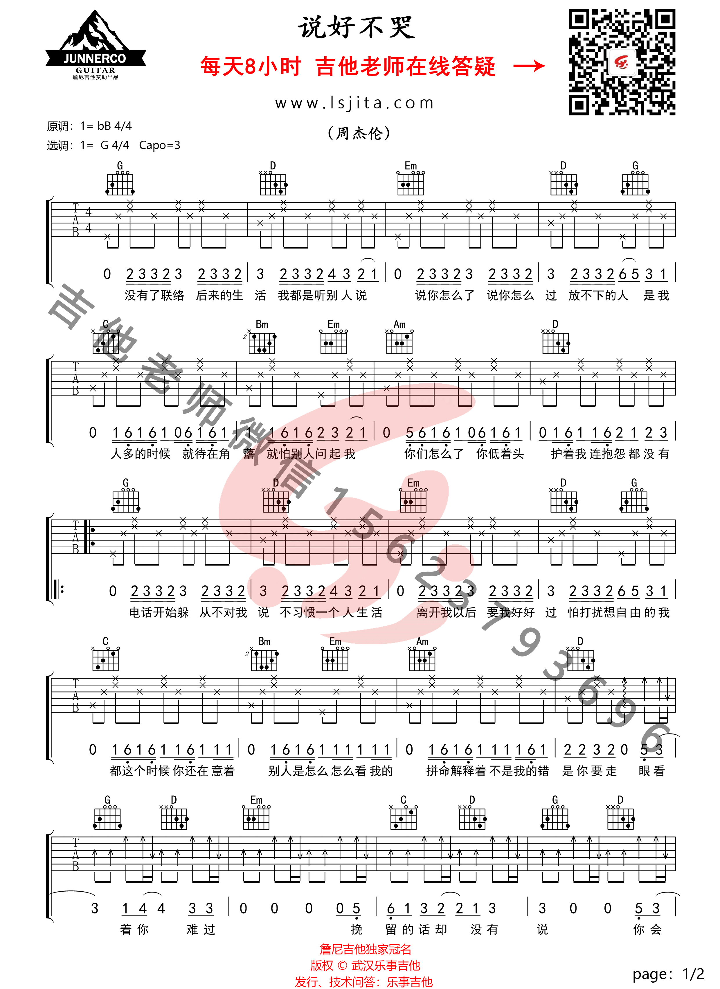 曲谱介绍: 周杰伦《说好不哭》吉他弹唱谱,采用G调指法编配,共有2张高清图谱,免翻页排版设计。