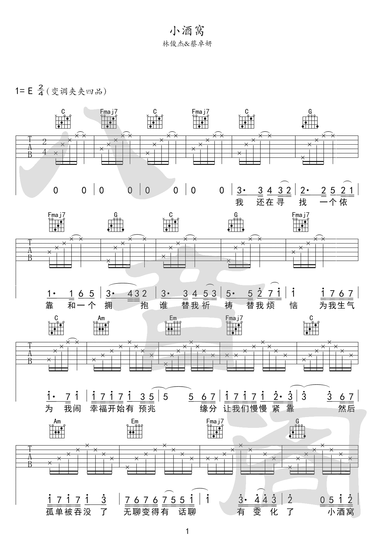 小酒窝吉他谱 - 林俊杰/蔡卓妍 - C调吉他弹唱谱