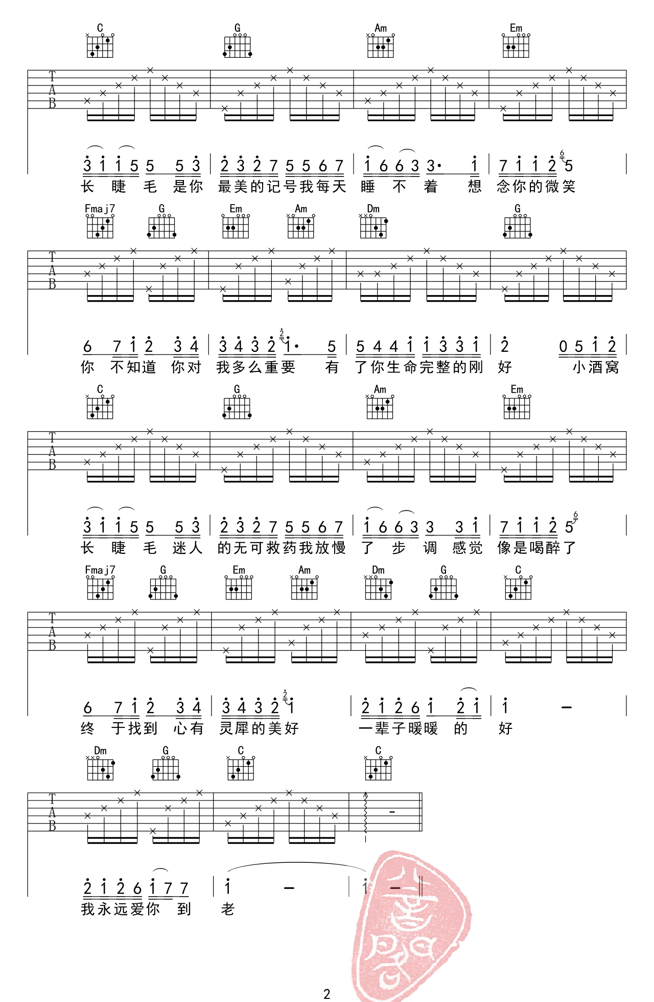 曲谱介绍: 林俊杰/蔡卓妍《小酒窝》吉他弹唱谱,采用C调指法编配,共有2张高清图谱,免翻页排版设计。
