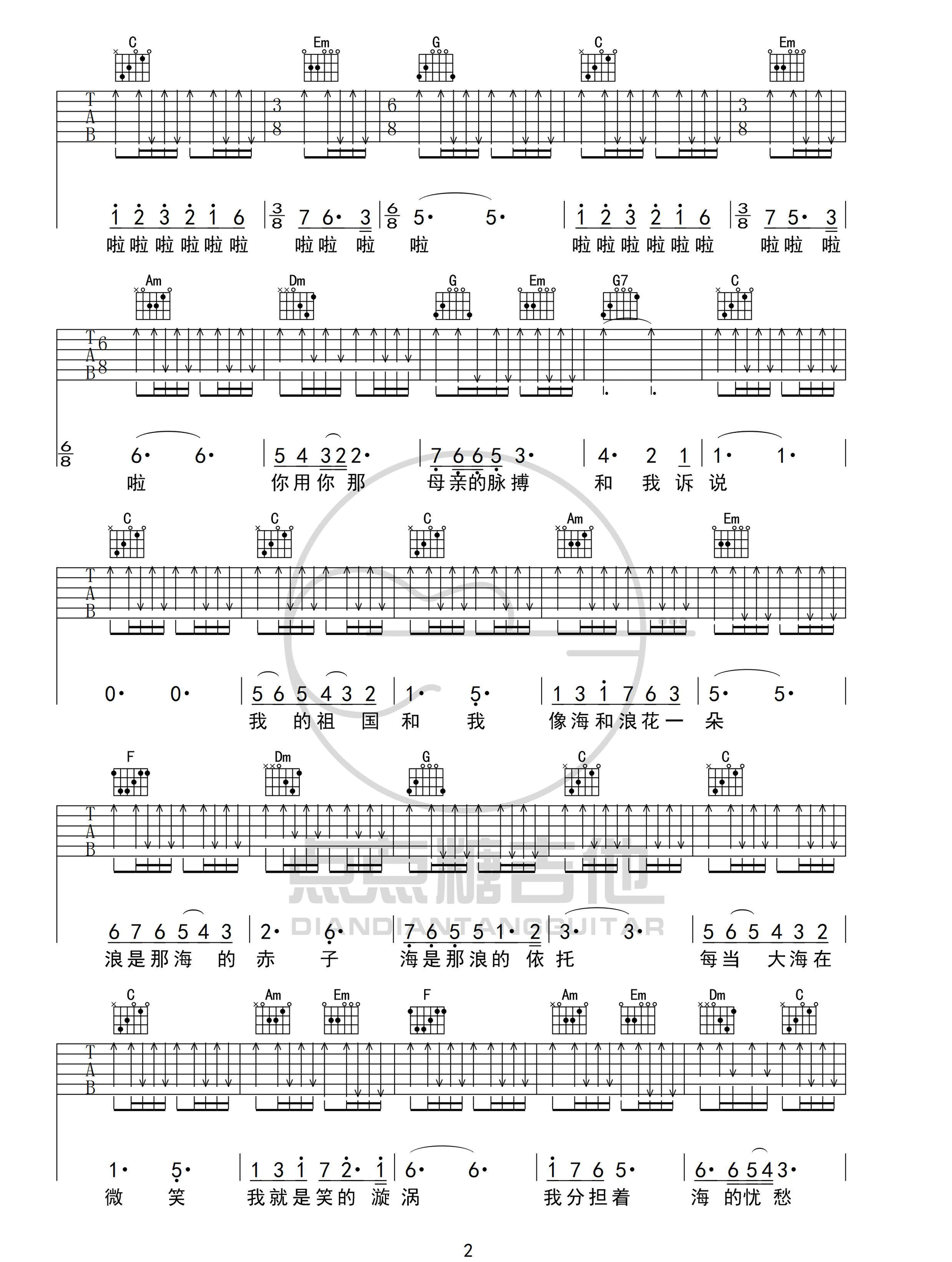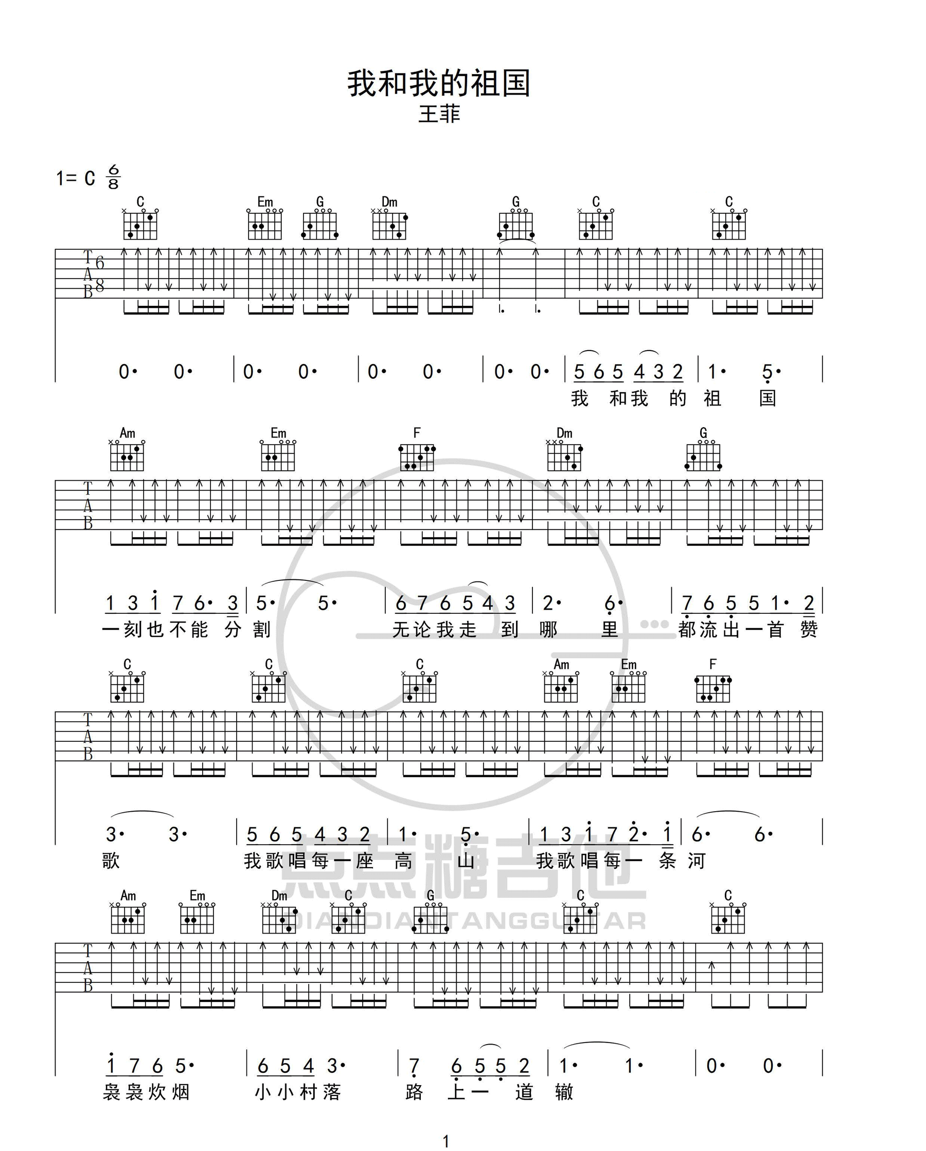 曲谱介绍: 王菲《我和我的祖国》吉他弹唱谱,采用C调指法编配原版,共有3张高清图谱。