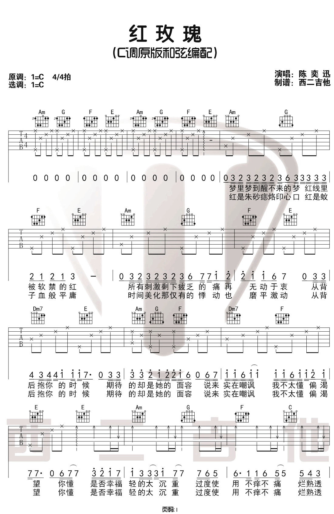 红玫瑰吉他谱 - 陈奕迅 - C调吉他弹唱谱 - 原版
