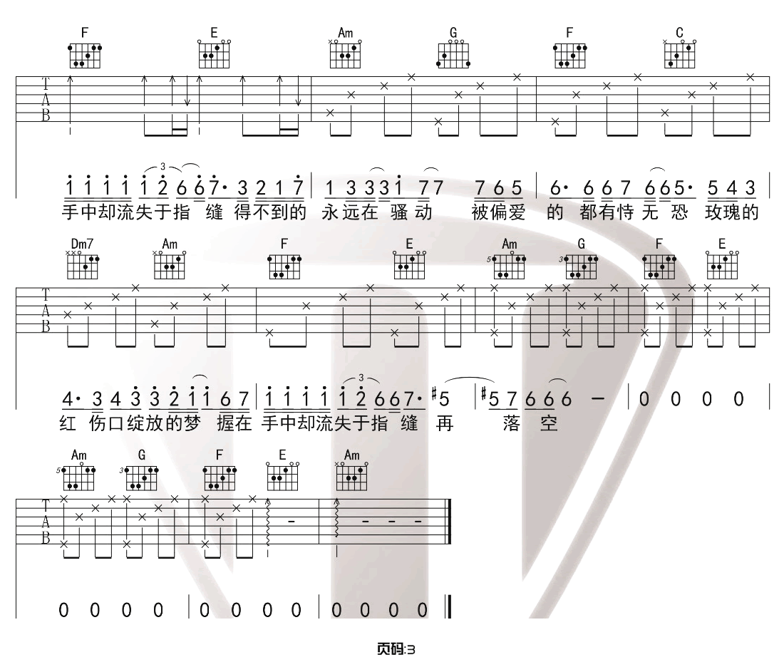 曲谱介绍: 陈奕迅《红玫瑰》吉他弹唱谱,采用C调指法编配原版,共有3张高清图谱。