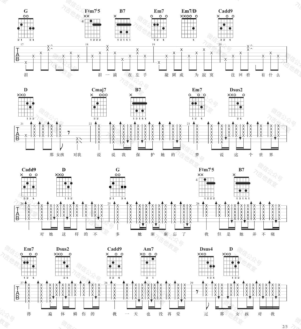 曲谱介绍: 黄义达《那女孩对我说》吉他弹唱谱,采用G调指法编配原版,共有3张高清图谱。