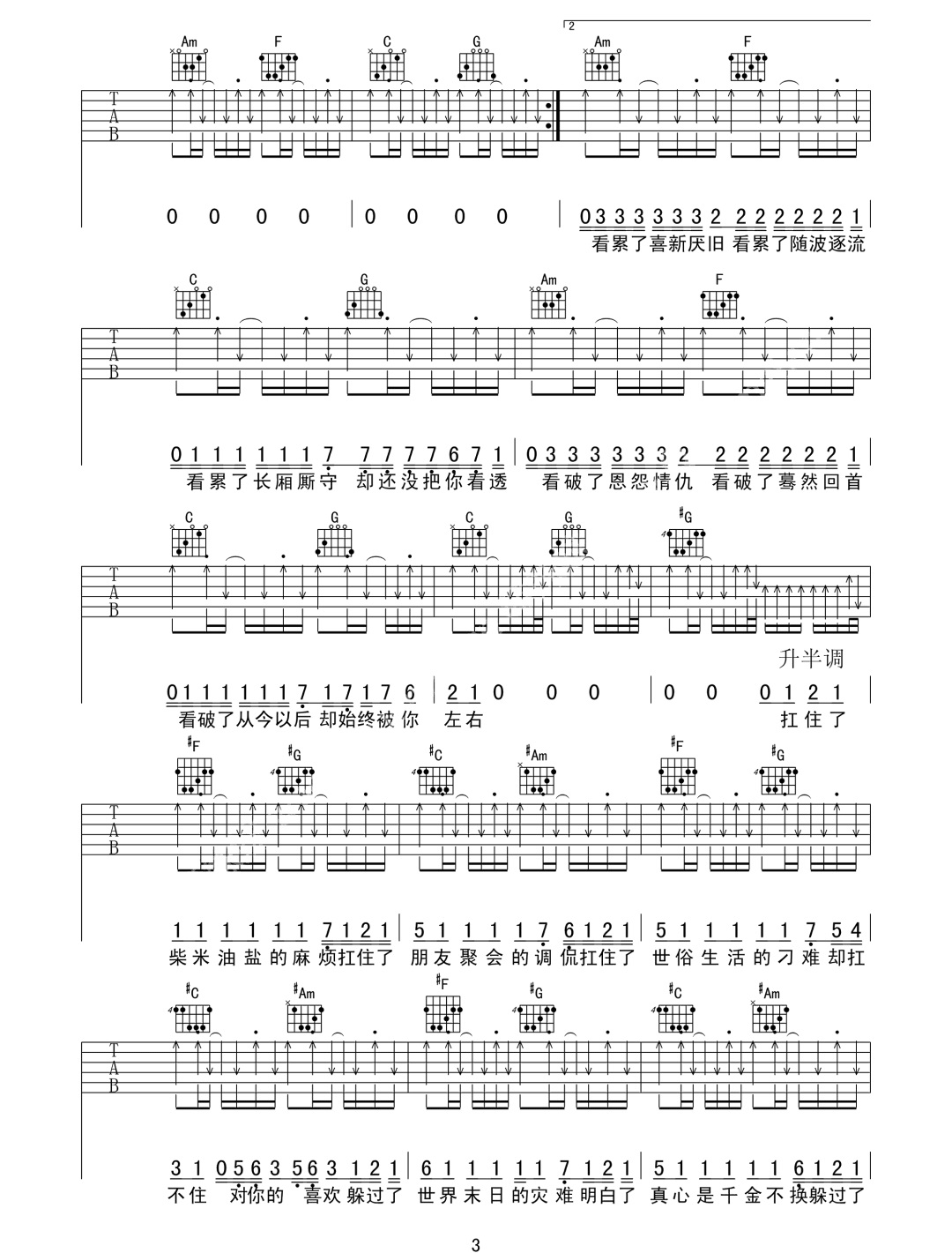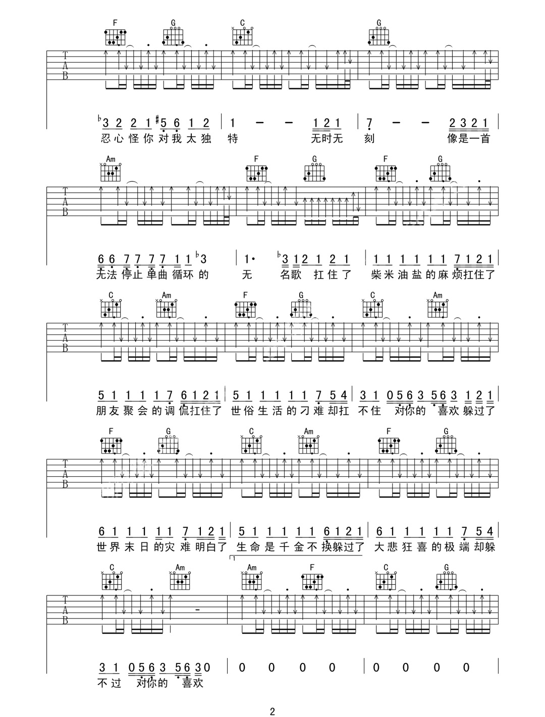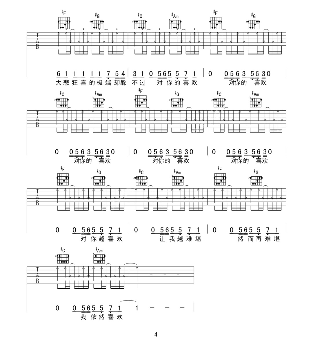 曲谱介绍: 阿肆《喜欢》吉他弹唱谱,采用C调指法编配原版,共有4张高清图谱。