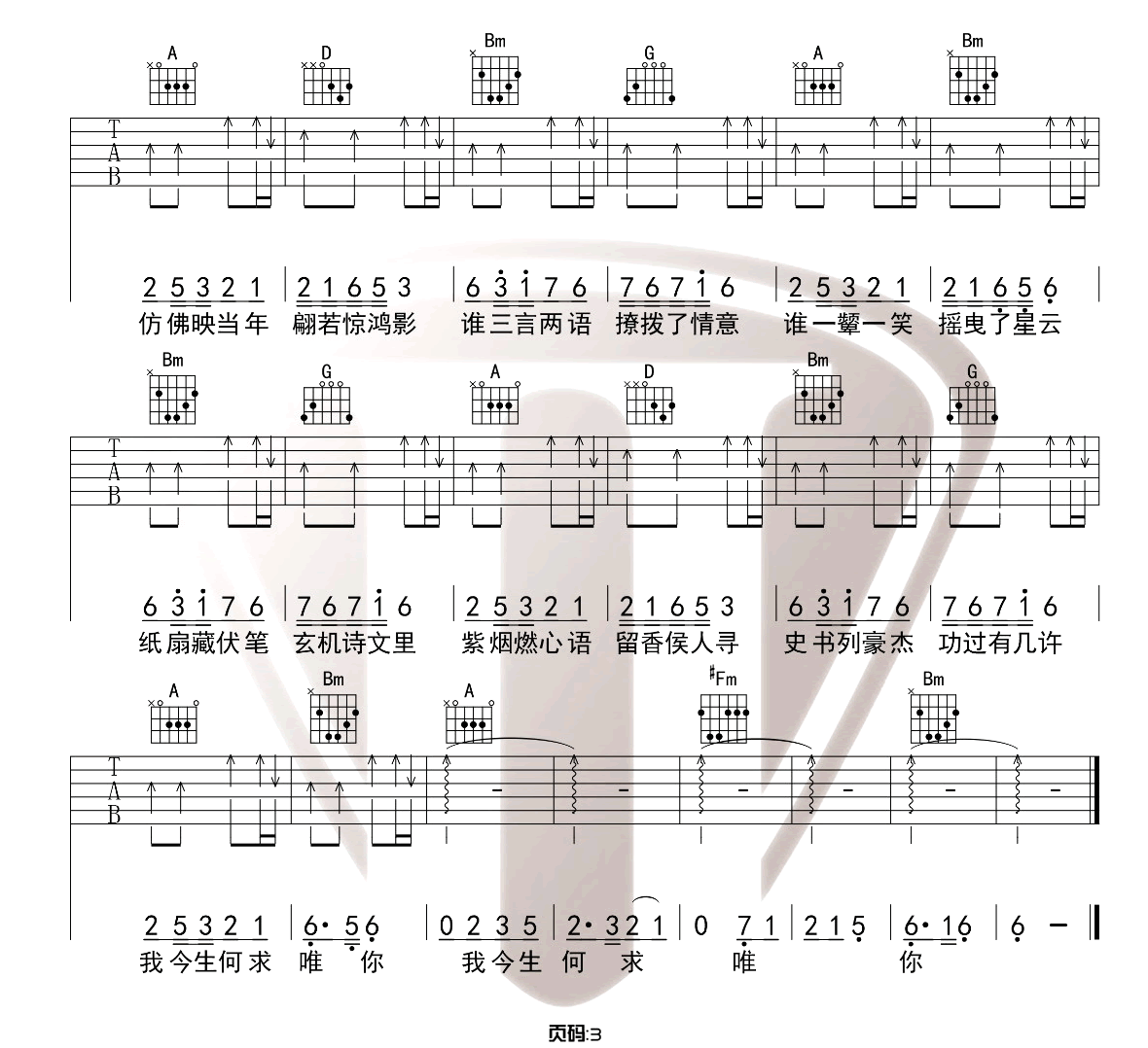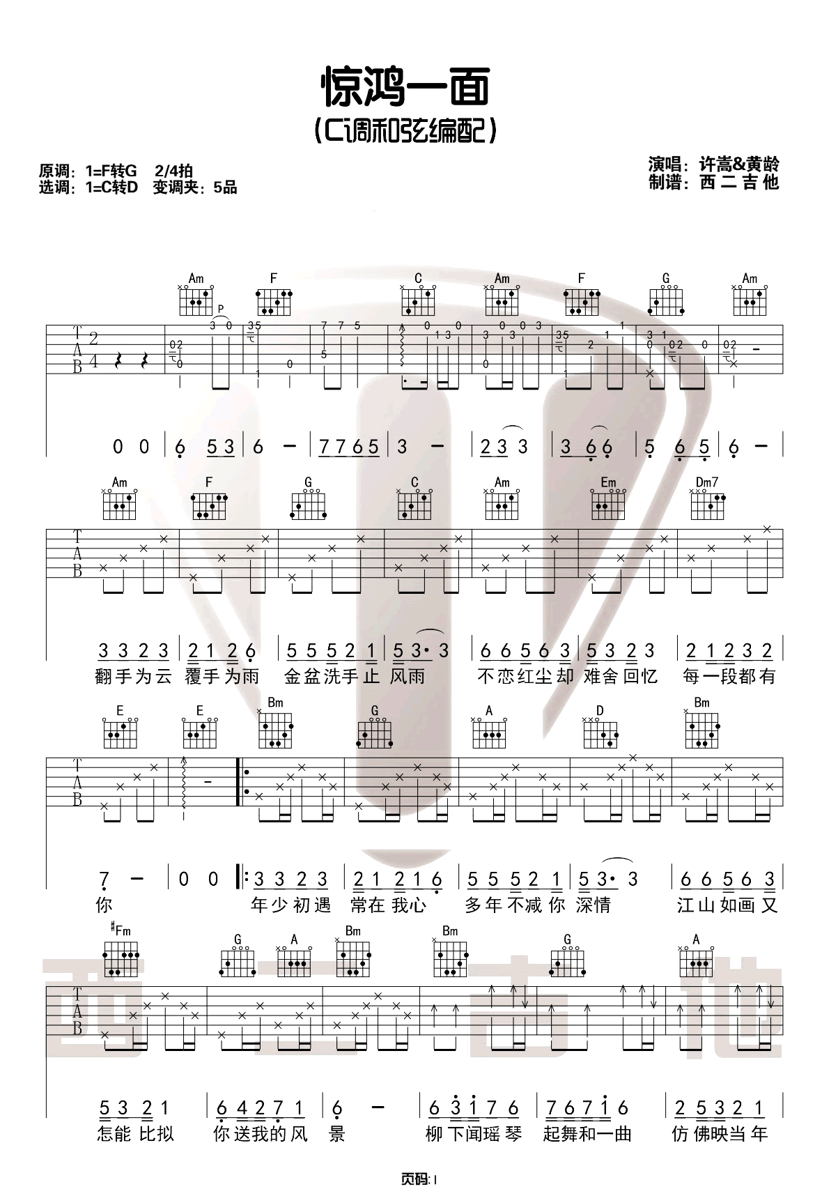 曲谱介绍: 许嵩/黄龄《惊鸿一面》吉他弹唱谱,采用C调指法编配原版,共有3张高清图谱。
