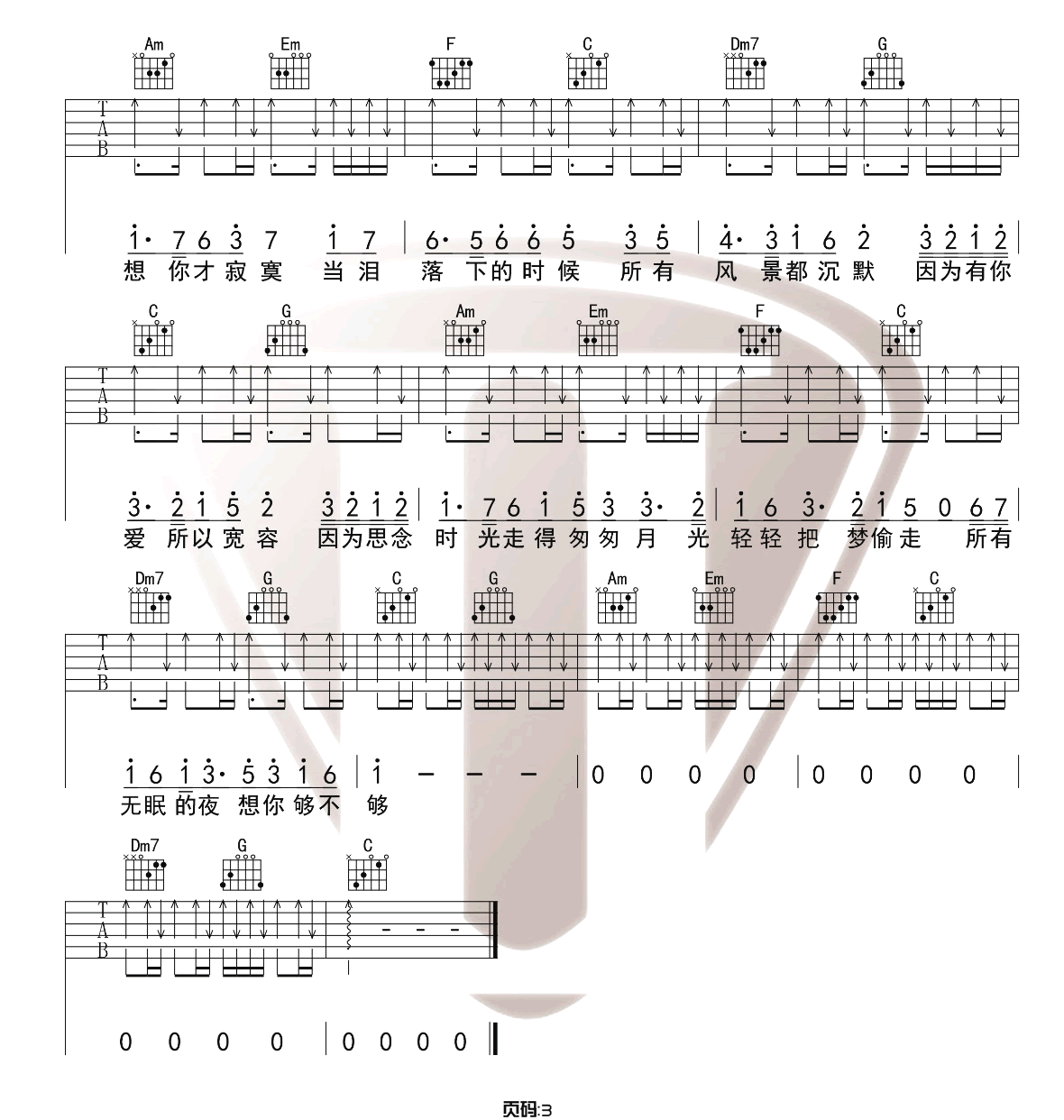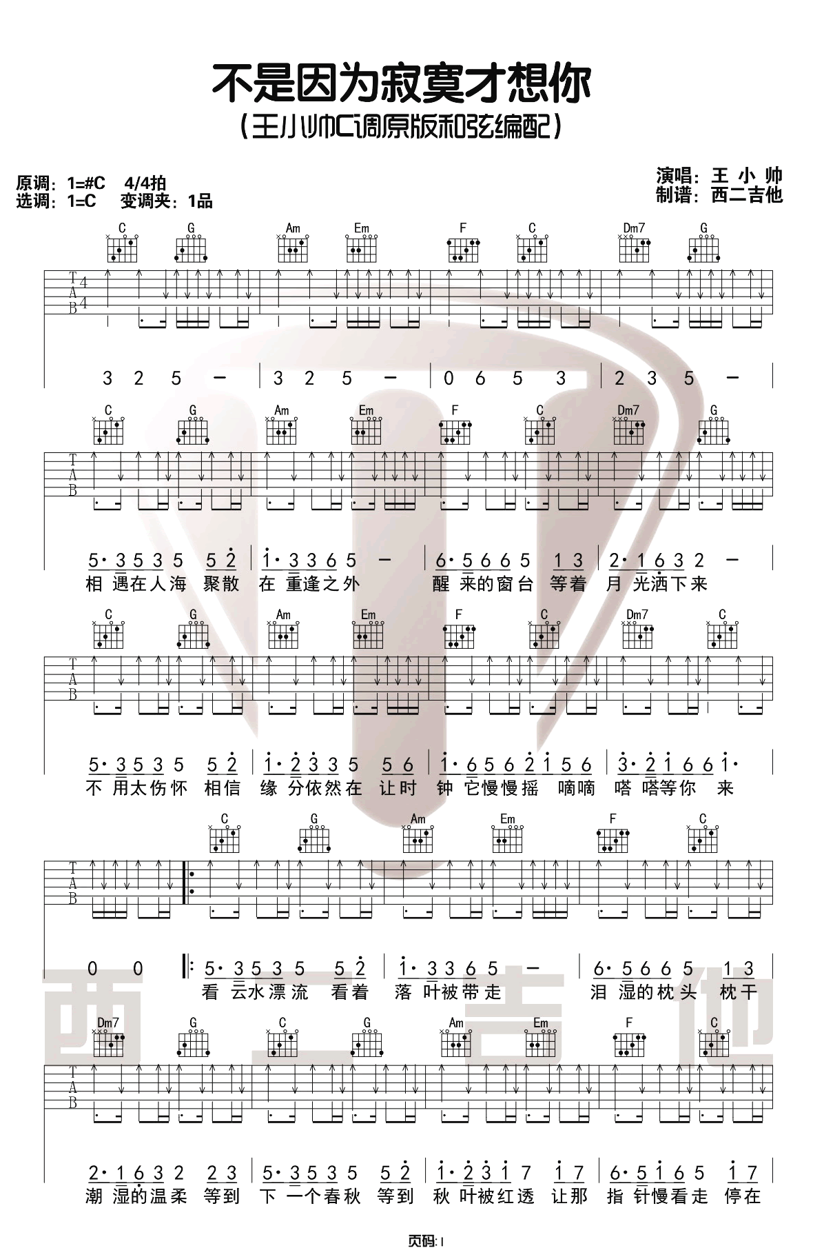曲谱介绍: 王小帅《不是因为寂寞才想你》吉他弹唱谱,采用C调指法编配,共有3张高清图谱。