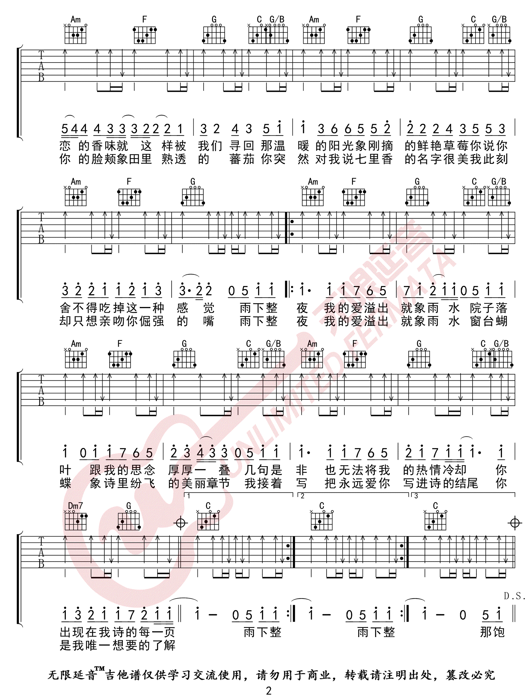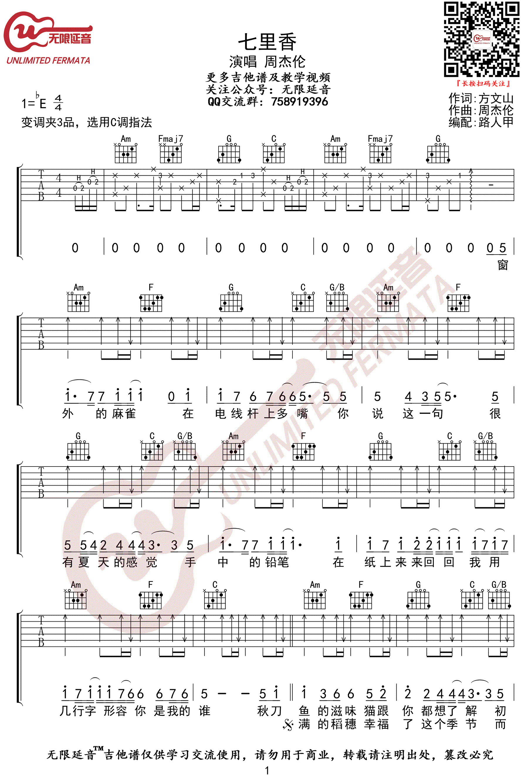 曲谱介绍: 周杰伦《七里香》吉他弹唱谱,采用C调指法编配,共有3张高清图谱。